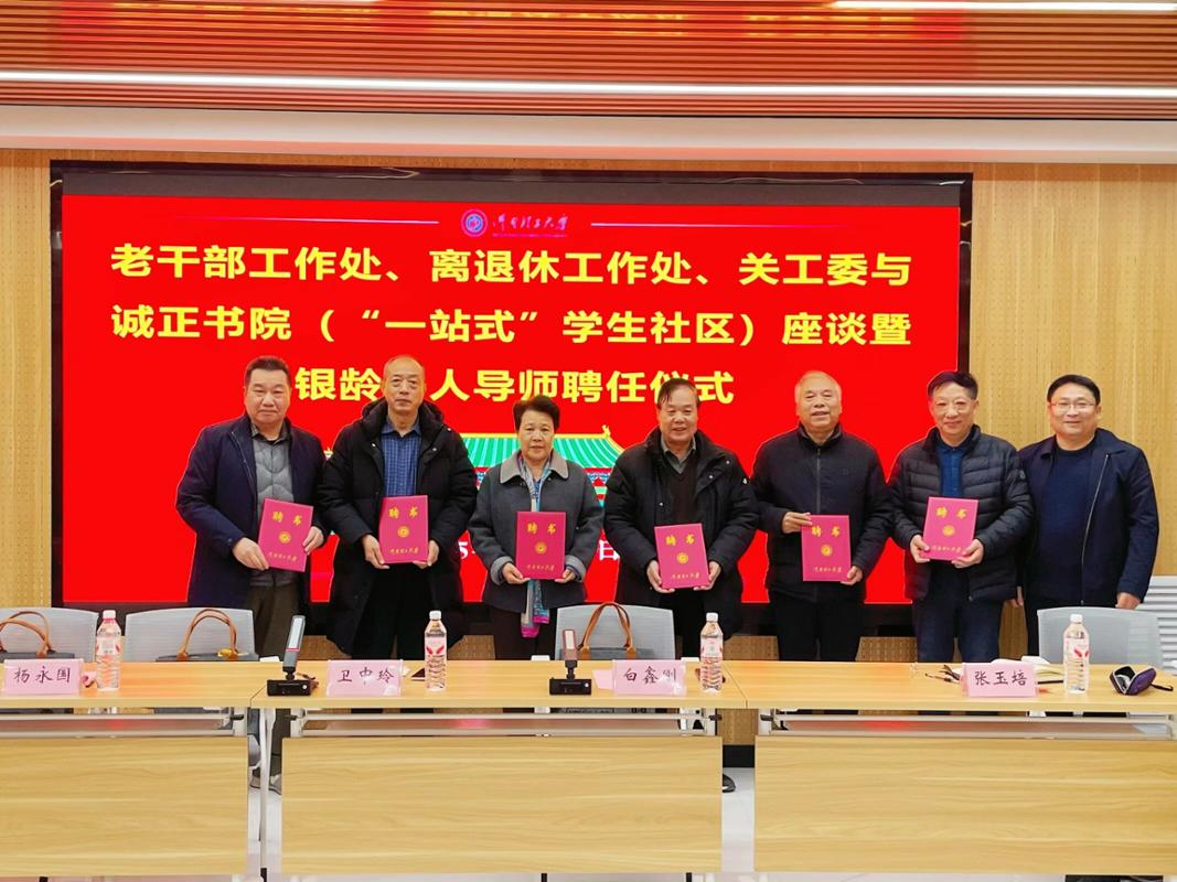 近日,河南理工大学关工委、党委老干部工作处(离退休工作处)与诚正书院(“一站式”学生社区)座谈暨“银龄育人导师”聘任仪式在诚正书院二楼会议室举行。校党委副书记白鑫刚,校关工委常务副主任卫中玲,关工委“五老”专职委员张玉培、杨永国、张国成、朱天明、邵强应邀出席,党委老干部工作处(离退休工作处)和学生社区相关负责人、育人导师、科室负责人及学生代表共同参加。