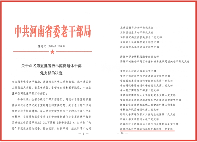 近日,河南省委老干部局印发文件,命名通报河南省第五批示范离退休干部党支部。我校离退休工作处党委馨苑第一党支部(以下简称馨苑一支部)荣获命名,这是我校首次获此殊荣。
