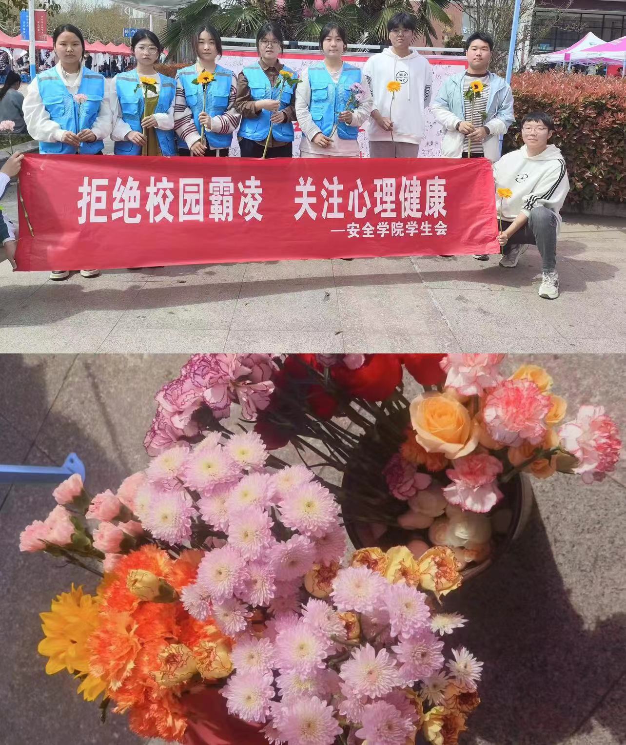 春日融融,和风阵阵。为增强学生的自我保护意识,宣传普及心理健康知识,助力平安校园建设,3月30日上午,安全学院学生会联合我院心理健康工作小组在学苑餐厅门口举办了“拒绝校园霸凌,关注心理健康”主题活动。