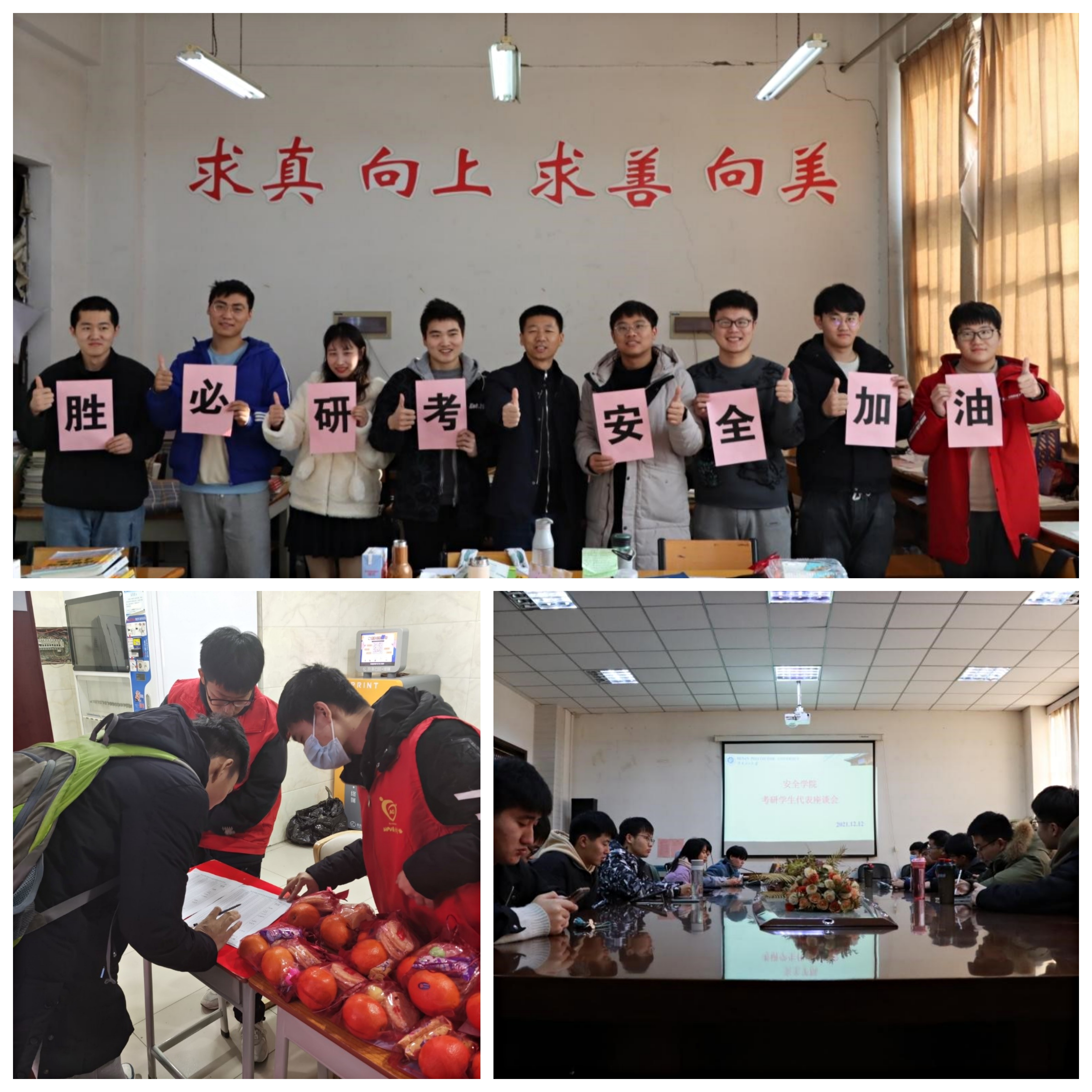 为舒缓考研学子压力,进一步增强学习动力和自信心,近日,安全学院在学院会议室、考研教室、学生宿舍楼等场所开展“天道酬勤,爱心助力”为主题的考研助力系列活动。该院领导、毕业班辅导员、青年志愿者协会和2021级研究生等参与了相关活动。