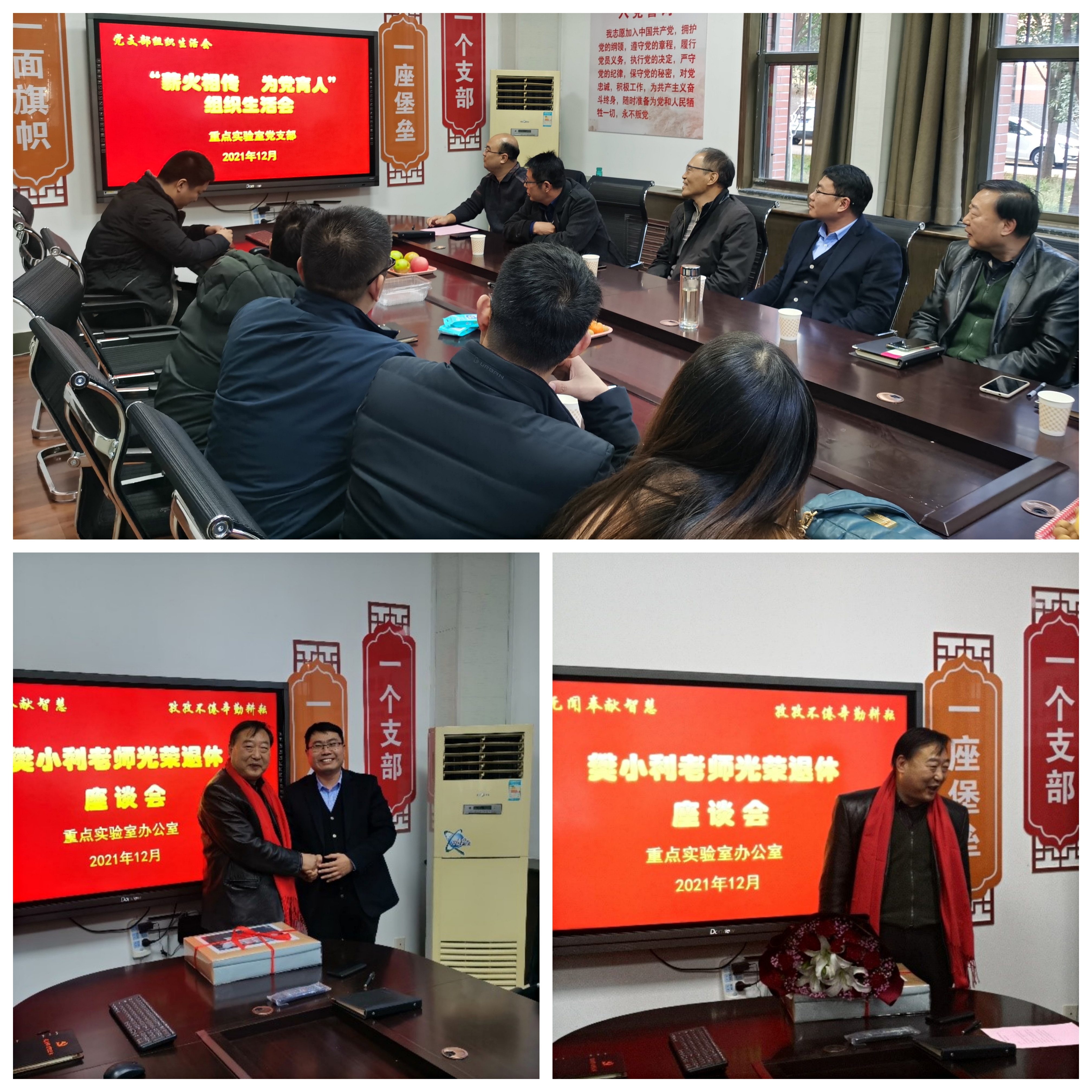 2021年12月21日下午, 安全学院重点实验室党支部开展“薪火相传,为党育人”主题党日活动暨樊小利老师光荣退休座谈会,参加座谈的有安全学院相关负责人及重点实验室全体教师,座谈会由重点实验室支部书记温志辉主持。