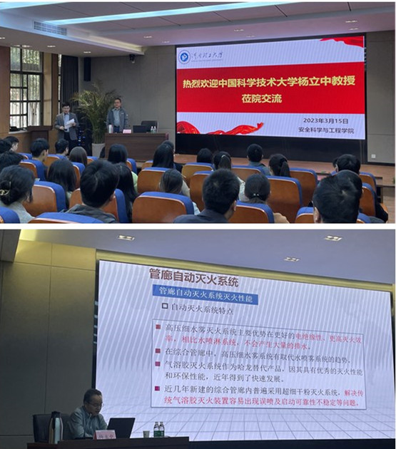 报告会上,杨立中教授简要介绍了中国科学技术大学火灾科学国家重点实验室基本情况,并结合自己近年来承担的科研项目,就“隧道、城市地下综合管廊火灾防控”、“交通工具(汽车、火车)火灾防控”、“新能源(锂电池、储能电站、太阳能、核电站)火灾防控”三个研究方向的研究背景、已开展研究工作、主要研究成果及工程应用效果等进行了详细介绍。此外,杨立中教授结合多年的科研工作经历,就火灾科学领域的科研选题、研究思路与方法、科研成果转化与应用等方面的心得体会与与会师生进行了分享。报告会结束后,杨立中教授参观了我院火灾防治相关实验室,并同学院老师就项目合作、实验室建设和研究方向凝练等问题进行了广泛的交流。