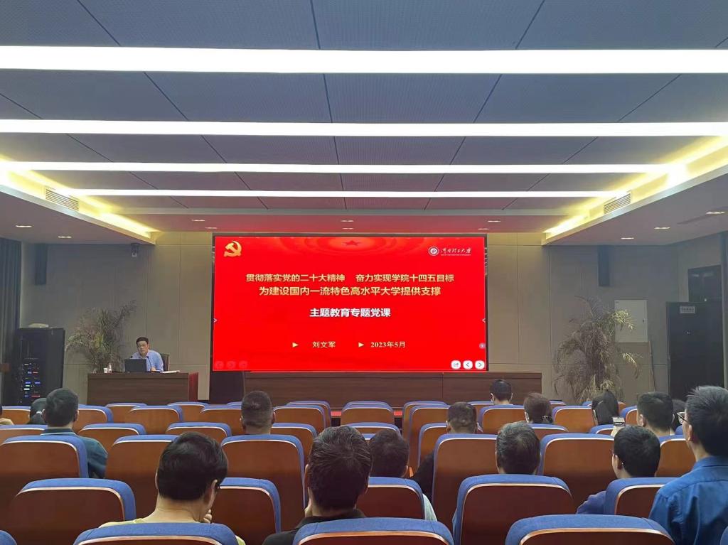 为持续推进学习贯彻习近平新时代中国特色社会主义思想主题教育走深走实,5月30日下午,安全学院党委书记刘文军在学院楼101会议室为全体教职工以《贯彻落实党的二十大精神,奋力实现学院“十四五”目标,为建设国内一流特色高水平大学提供支撑》为题讲授主题教育专题党课。