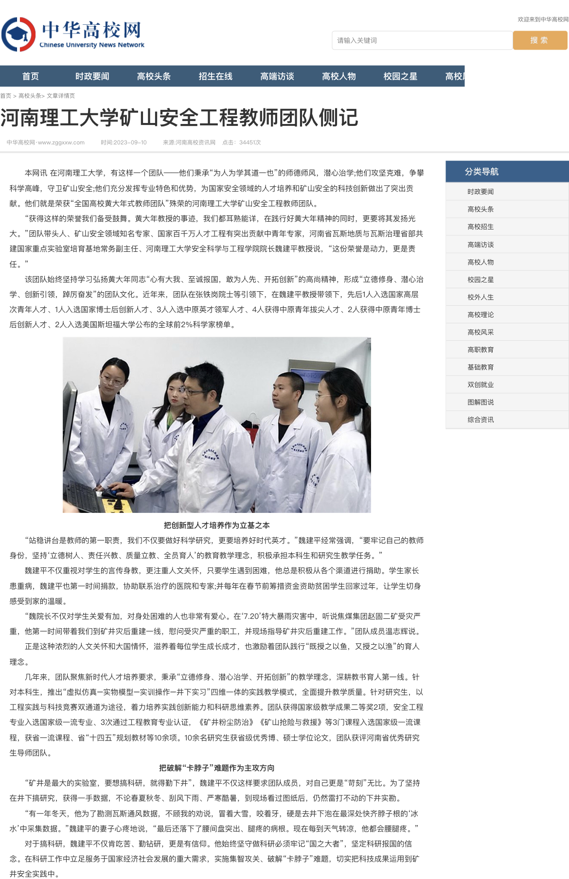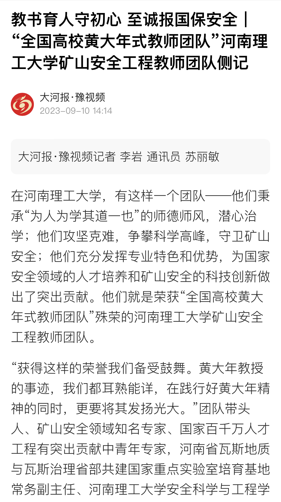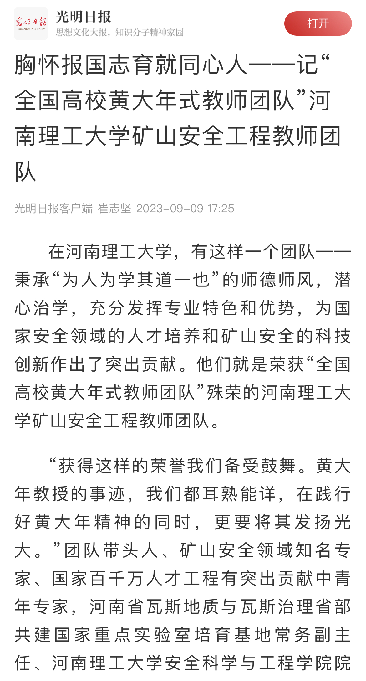 2023年9月9日,光明日报客户端以《胸怀报国志育就同心人——记“全国高校黄大年式教师团队”河南理工大学矿山安全工程教师团队》为题,并配发图片,报道学校矿山安全工程教师团队秉承“为人为学其道一也”的师德师风,潜心治学,充分发挥专业特色和优势,为国家安全领域的人才培养和矿山安全的科技创新作出了突出贡献,荣获“全国高校黄大年式教师团队”。中华高校网、河南高校资讯网、中新资讯网等也对此进行了报道。