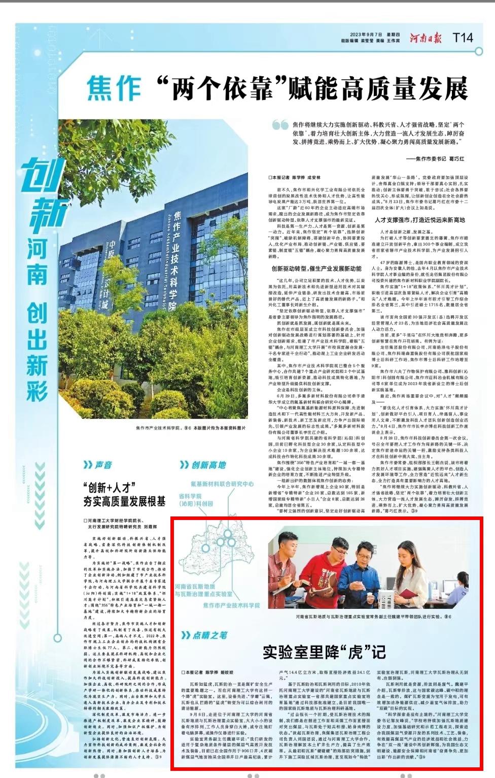 9月7日,《河南日报》第14版以《实验室里降“虎”记》为题,以学校河南省瓦斯地质与瓦斯治理重点实验室为依托,将瓦斯从拦路的“猛虎”转变为可以综合利用的清洁能源的相关情况。