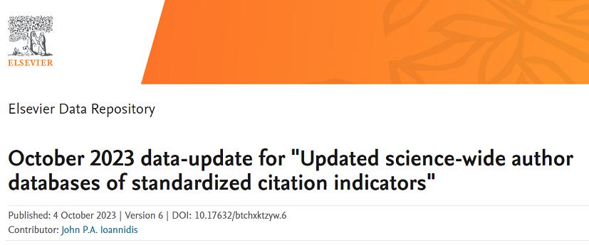 2023年10月4日,斯坦福大学John P. A. Ioannidis教授团队更新了其发布的全球前2%顶尖科学家榜单,并在Elsevier旗下Mendeley Data发布(October 2023 data-update for "Updated science-wide author databases of standardized citation indicators")。本次统计数据时间节点为1960-2023年,我院四位教师上榜。