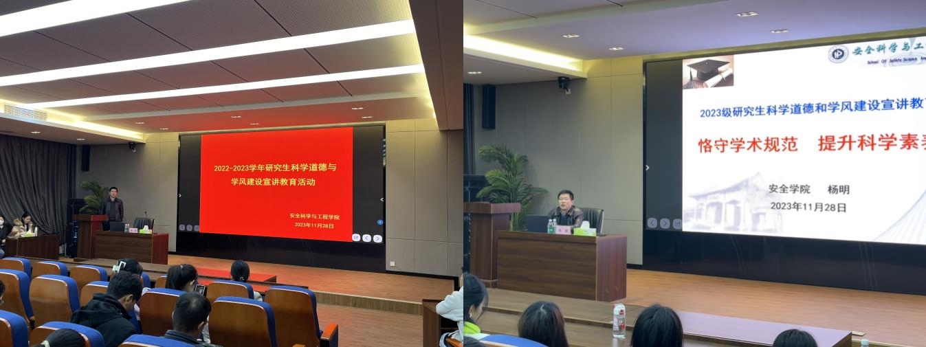 为深入贯彻落实习近平总书记在科学家座谈会上的重要讲话精神,倡导广大研究生遵守学术规范,安全学院于11月28日下午在学院101会议室召开2022-2023学年研究生科学道德与学风建设宣讲活动,邀请学院副院长杨明作“恪守学术规范,提升科学素养”主题宣讲,2023级全体研究生参加本次活动。
