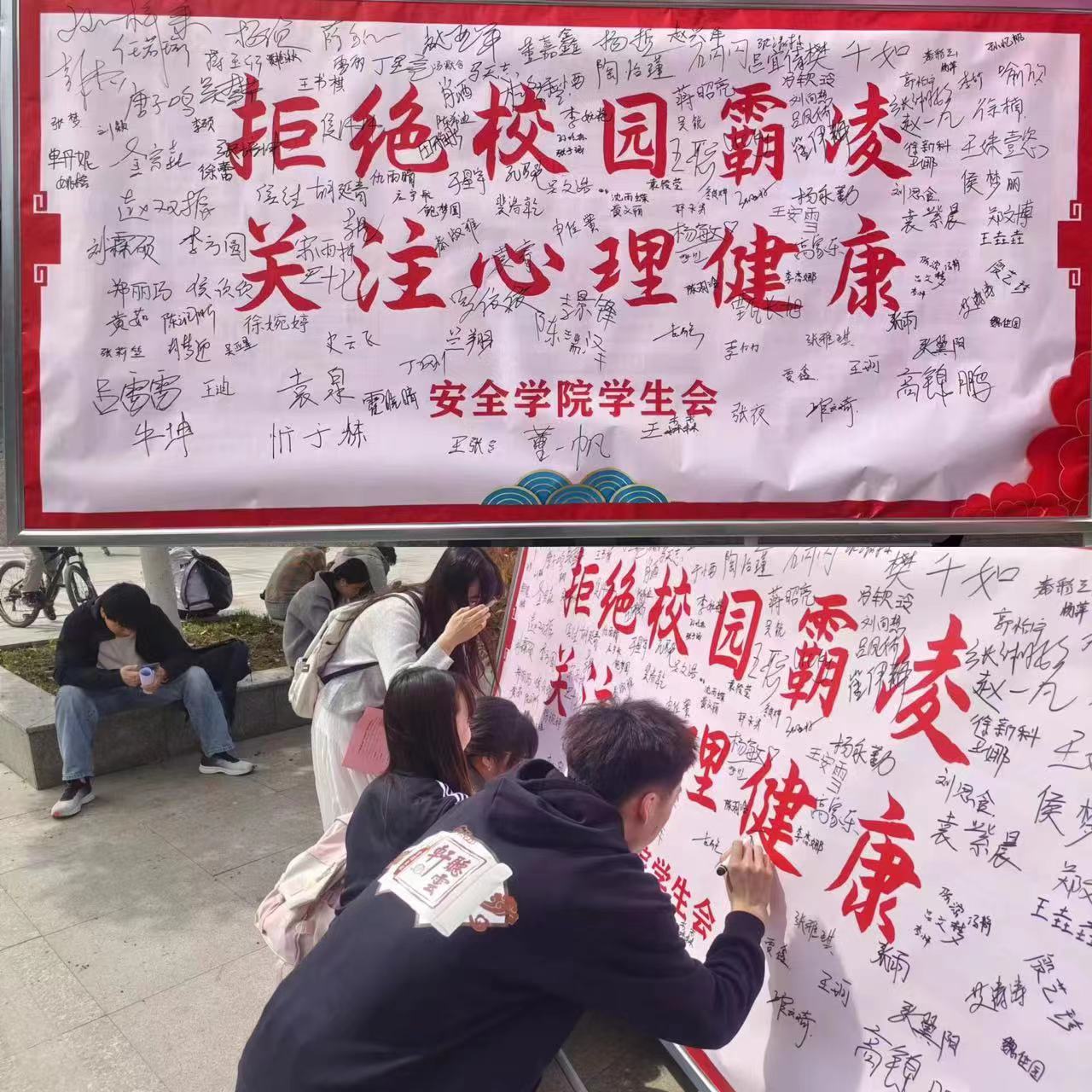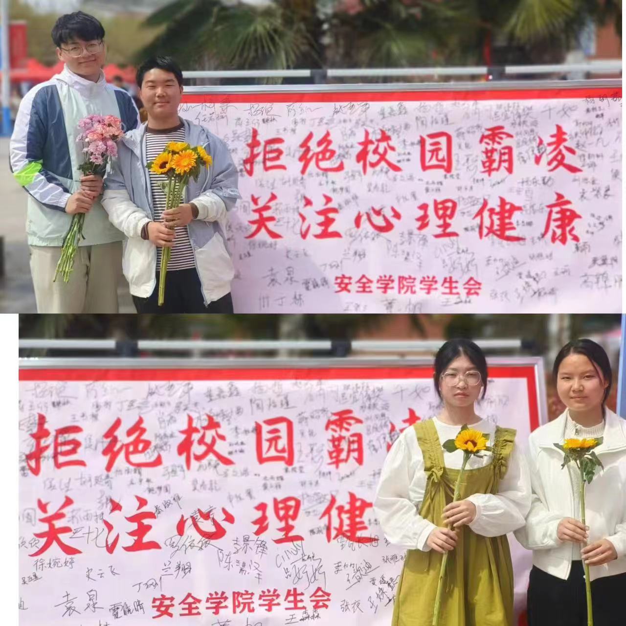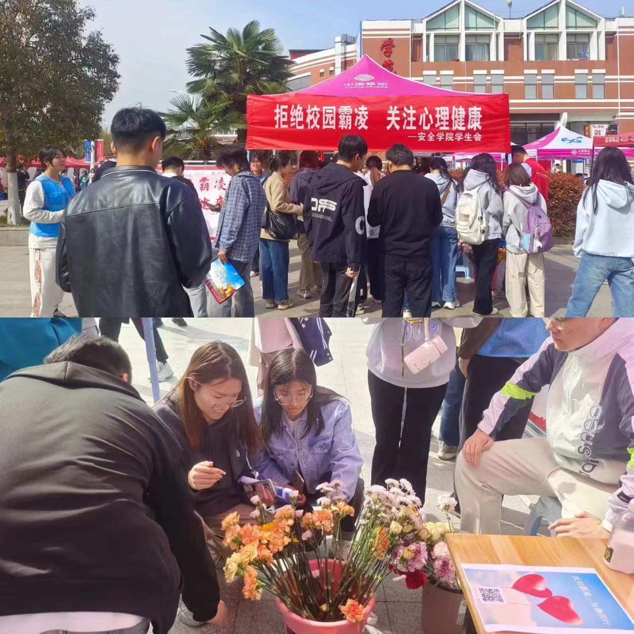 春日融融,和风阵阵。为增强学生的自我保护意识,宣传普及心理健康知识,助力平安校园建设,3月30日上午,安全学院学生会联合我院心理健康工作小组在学苑餐厅门口举办了“拒绝校园霸凌,关注心理健康”主题活动。