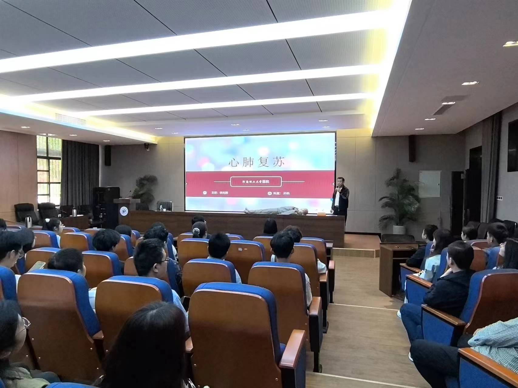 校医院副主任医师李光辉从“心肺复苏、AED除颤仪的使用、解除气道异物梗阻”等几个方面内容进行生命教育专题讲解,对相关急救技能操作要领进行了现场示范,引导大家如何把握住“黄金时间”进行有效的应急救护,并教会大家如何使用海姆立克急救法排出患者气道异物。接着,校第一附属医院副主任医师乔雯雯为大家讲解了“冠心病、主动脉夹层、急性肺动脉栓塞”等急性胸痛及急救常识。与会师生积极主动上前进行实际操作训练,细致领会急救操作标准与要领。