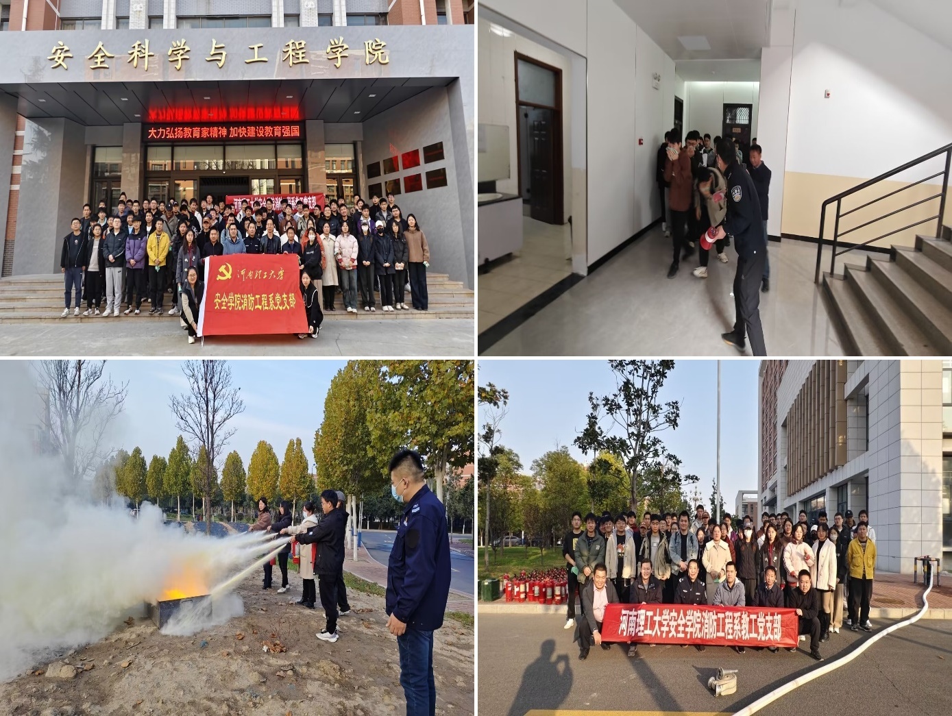 为进一步强化消防工程专业学生的动手技能,值此全国消防宣传月活动期间,11月21日下午,消防工程系师生在安全学院楼及重点实验室大楼西北角开展了“应急疏散与灭火演练”的主题党日活动。活动邀请了学校保卫处消防科的工作人员给与现场指导。