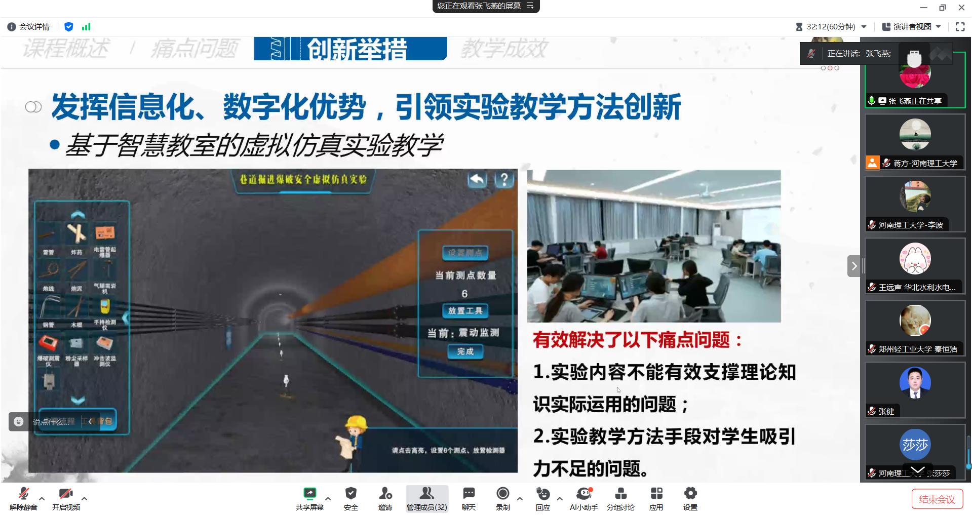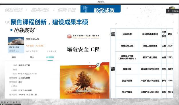 随后,两位示范课程教师分享了他们的教学经验和创新实践。作为河南省高等学校教学名师,张飞燕教授详细讲解了《爆破安全课程实验》的创新实践,从高危到安全的转变,展示了如何在保障安全的前提下,提升教学质量和学生的实践能力。张健副教授分享了基于S-T-E-M教学理念的思-专-创-能创新课堂实践探索,强调了跨学科教学和创新能力培养的重要性。