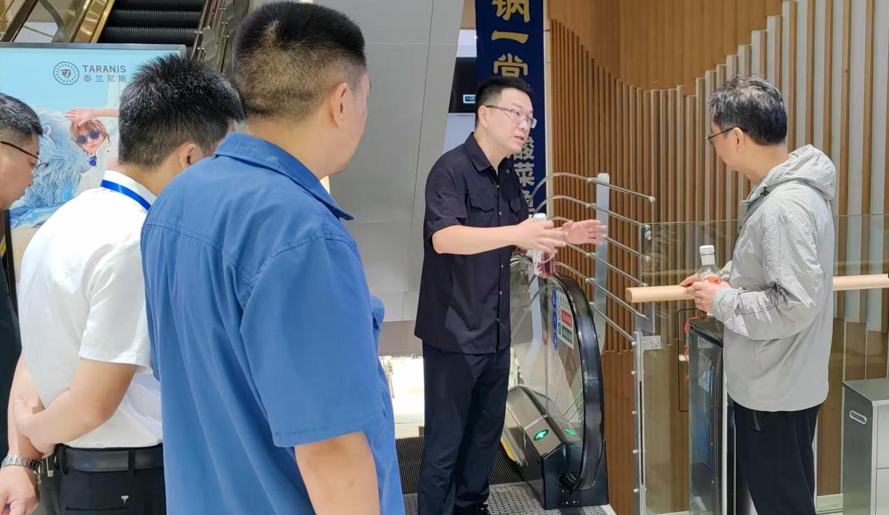 首先丹尼斯电梯维护保养的值班经理给大家介绍了基本情况:焦作丹尼斯生活广场(塔南路)共设有7层(地下2层、地上5层),总建筑面积约7.3万平方米,共有电梯32部(包含客梯、货梯、自动扶梯、自动人行道等),大部分购于2016年,至今已安全运行将近10年。特检院焦作分院崔国龙等人,给大家细致地讲解了电梯特检的步骤、流程,以及运行发生意外情况时应急处置措施,随后两支部成员进行了热烈的讨论交流。特检院焦作分院同志精湛的业务技能和热情的态度,给观摩学习的同志们留下了深刻的印象。
