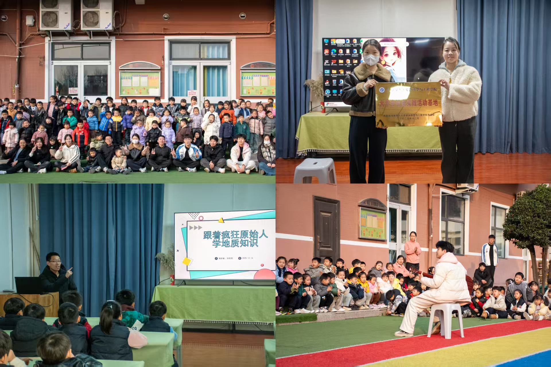 在双方师生共同见证下,我院向幼儿园授予“安全科学与工程学院大学生社会实践基地”铭牌,标志着双方共建的大学生社会实践基地正式启用,为学子服务社会、锻炼能力提供了新平台。我院教师、中国煤炭协会科学传播专家、河南理工大学地学探秘博士科普团队成员许欣然以动画片《疯狂原始人》为切入点,通过情景模拟和趣味问答等形式,将地质知识转化为生动有趣的科普内容,让孩子们在轻松愉快的氛围中学习地球科学知识。学院学生代表为孩子们表演了精彩的文艺节目,现场气氛热烈融洽。