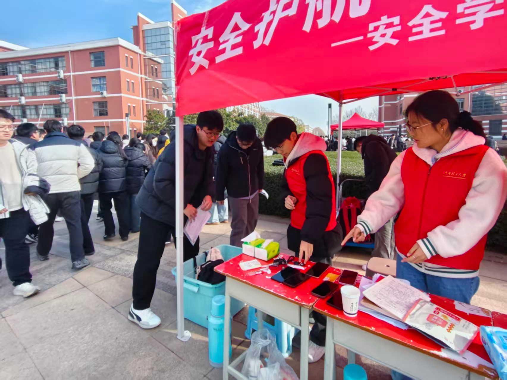 为助力安全学子实现学业梦想,2025 年全国硕士研究生招生考试期间,安全学院青年志愿者协会、安全学院本科生党支部在一教、二教及三教周边设立了两个志愿服务站,开展“安全护航,研路同行”志愿服务,为考研学子提供保障与支持,让寒冬里的逐梦旅程满是暖意。