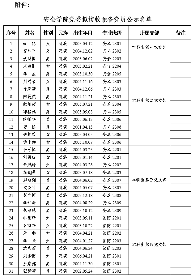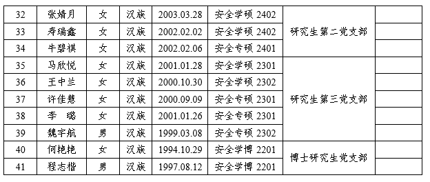 2025年11月22日至24日,本科生第一党支部、本科生第二党支部、本科生第三党支部、本科生第四党支部、研究生第二党支部、研究生第三党支部、博士研究生党支部先后召开支部委员会会议,对李想等41名发展对象的综合情况进行了审查,并提交安全学院党委预审。11月25日经学院党委预审,李想等41名发展对象符合预备党员条件,支部拟于近期召开支部大会,接收他们为预备党员。为发扬民主,广泛听取党员群众意见,接受广大党员群众监督,现将李想等41名发展对象情况予以公示,公示期限为2025年11月26日至12月2日。如有异议,请于公示期内将署名意见以书面形式或邮件形式向学院党委反映。