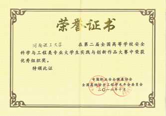 10月11-13日,第二届全国高校安全科学与工程类专业大学生实践与创新作品大赛在郑州大学中心体育馆举行。我院选送的6支队伍在大赛中获得一等奖1项、二等奖2项、三等奖3项,安全工程系副教授张飞燕老师荣获“优秀指导老师奖”,我校荣获优秀组织奖。
