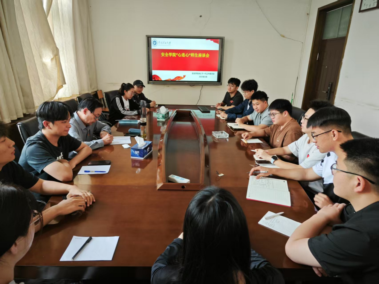 为进一步落实立德树人根本任务,引导毕业生爱国爱校、砥砺奋进,5月26日下午,安全学院关心下一代工作委员会在院215举行“心连心”师生座谈会,学院党建特聘组织员、老党员张玉培和2025届毕业班学生代表参加此次会议。