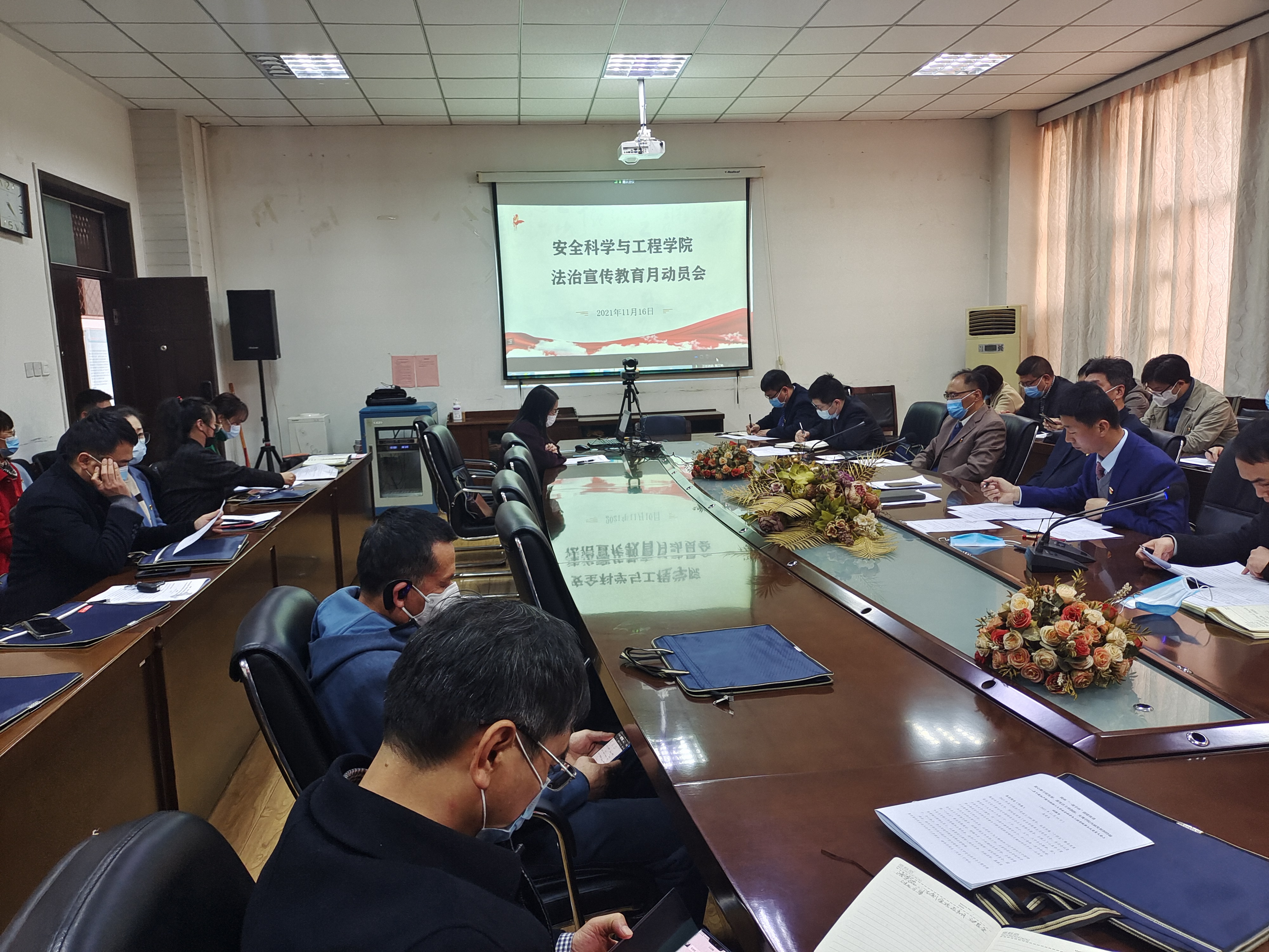 为深入贯彻落实国家 “八五”普法工作规划和中央全面依法治国工作会议精神,进一步弘扬法治精神、培育法治信仰,提高师生的法治意识和法治素养,11月17日下午,安全学院召开“法治宣传教育月”活动动员部署会,会议由安全学院党委副书记李怀珍主持。