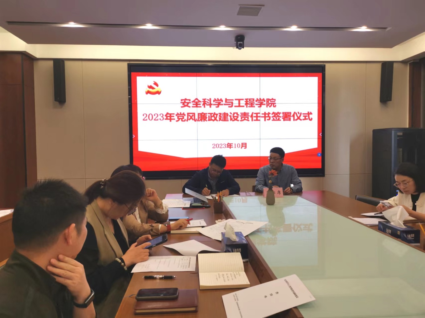 为深入贯彻落实二十届中央纪委二次全会、十一届河南省纪委三次全会精神,切实加强党风廉政建设,10月31日下午,学院在304会议室召开2023年党风廉政建设责任书签署仪式暨领导干部集体廉政谈话会。学院全体院领导及科级干部参加了此次会议。