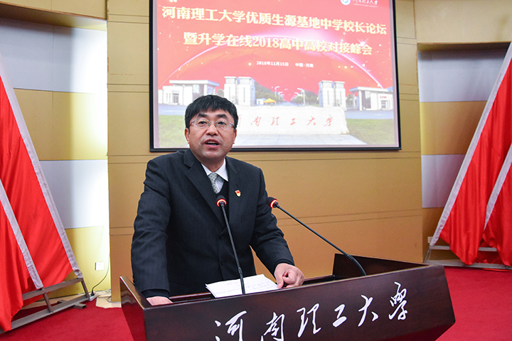 11月15日,我校优质生源基地中学校长论坛暨升学在线2018高中高校对接峰会在学校学术报告厅举行。校长杨小林出席并致辞,武汉升学在线科技股份有限公司董事长邵隆以及43所省内外高校代表、86所河南省重点高中代表参加了会议。会议由校党委副书记安士伟主持。