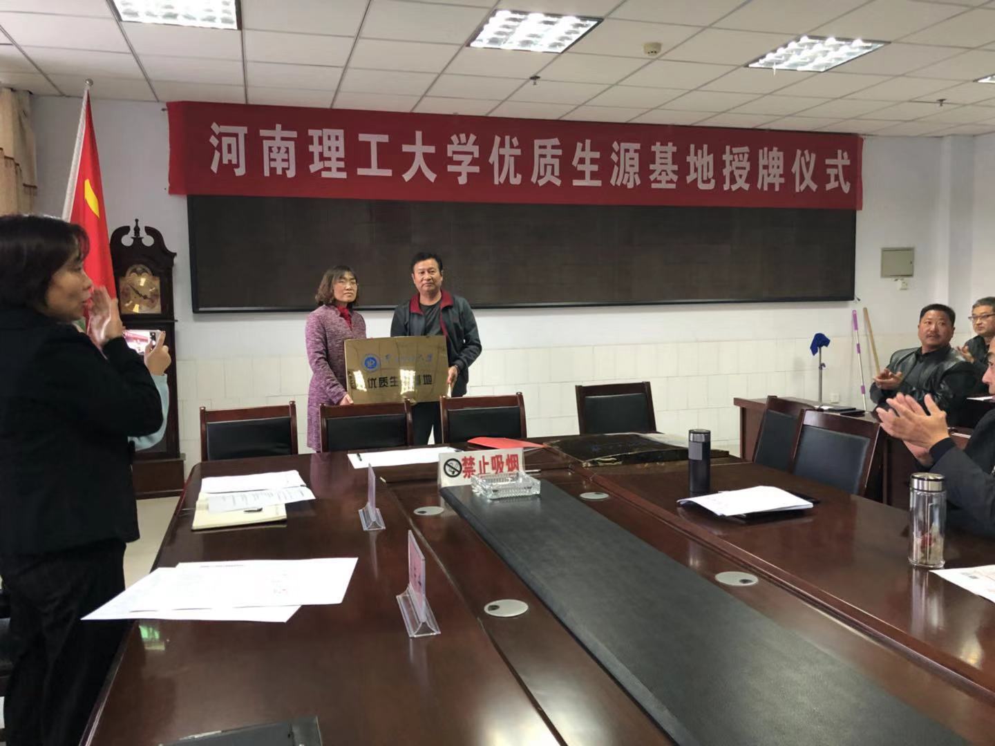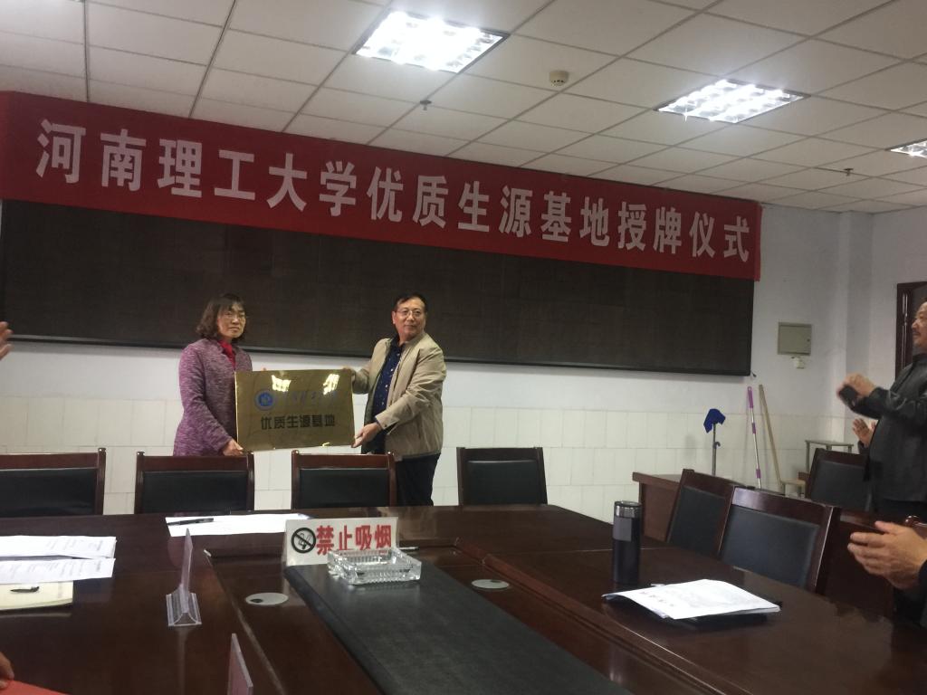 活动在武陟县第一中学报告厅举行。武陟县教育局局长孙小明、武陟一中校长马东升、武陟河朔中学校长荆福利以及两所中学的师生代表。武陟县教育局局长孙小明在致辞时,感谢河南理工大学对武陟教育的认可与肯定。本次授牌仪式,是对武陟一中和河朔中学的肯定,也是对武陟基础教育的认可。随后程明娥向与会领导和师生介绍了我校的办学历史、专业设置及近年来两所中学向我校输送的优质生源等情况。随后,双方代表签订了优质生源基地建设协议并举行了授牌仪式。