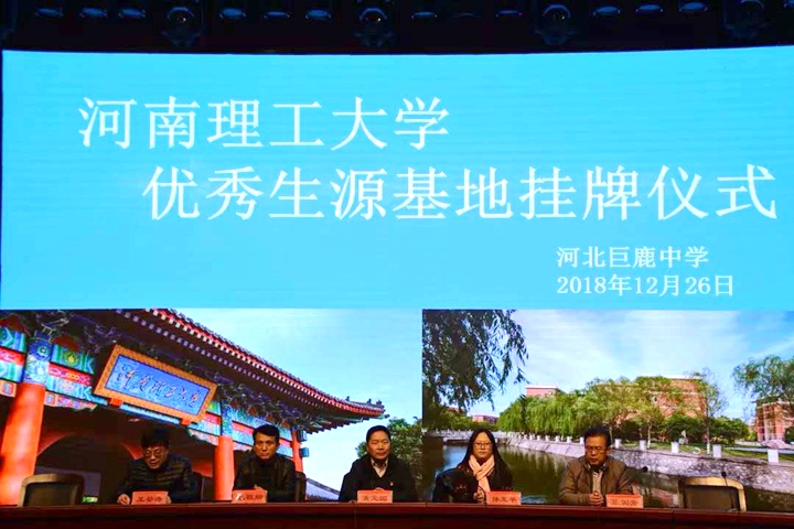 12月26日,工商管理学院党委书记黄定国一行赴河北巨鹿中学开展招生宣传工作,代表学校与河北巨鹿中学签订合作协议,并举行优质生源基地挂牌仪式。巨鹿县教育局长张敬瑞、巨鹿中学校长张国芳与该校200余名师生参加了会议。