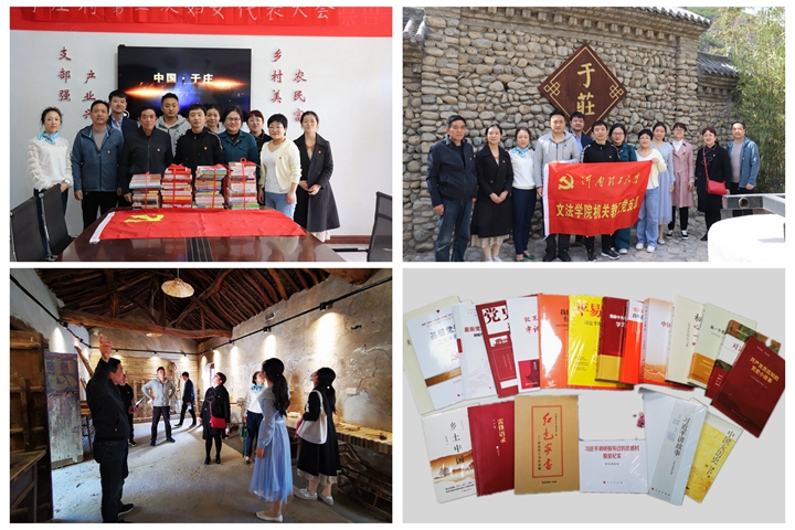 文法学院机关教工党支部与博爱县于庄村党支部自2019年结成共建单位以来,双方发挥各自优势,在乡村振兴和学生社会实践等方面开展合作,取得了积极成效。时值中国共产党建党100周年到来之际,文法学院机关教工党支部通过采购和捐赠等方式,募集了100本好书赠予于庄村党支部,内容涉及党史党建、政治理论、人文社科、文学教育和少儿读物等,于庄村党支部书记曹有福、驻村第一书记卢小峰接受了捐赠。