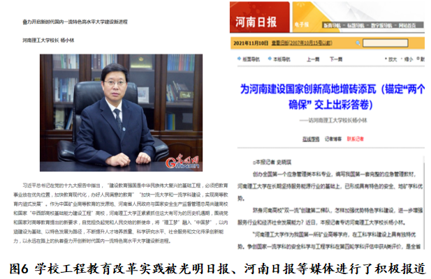 课题研究成果先后20余次在全国性会议上做经验分享,吸引了河南科技大学、河南工业大学、安徽理工大学以及河南农业大学等省内外高校高度关注,工程实践教学改革典型经验和特色做法在省内外高校推广应用,取得较好效果。同时,《光明日报》、《中国矿业报》、《中国教育报》、《河南日报》和《今日头条》等国家级、省级媒体对课题研究成果和河南理工大学等4所高校工程教育改革实践进行了报道(见图6)。