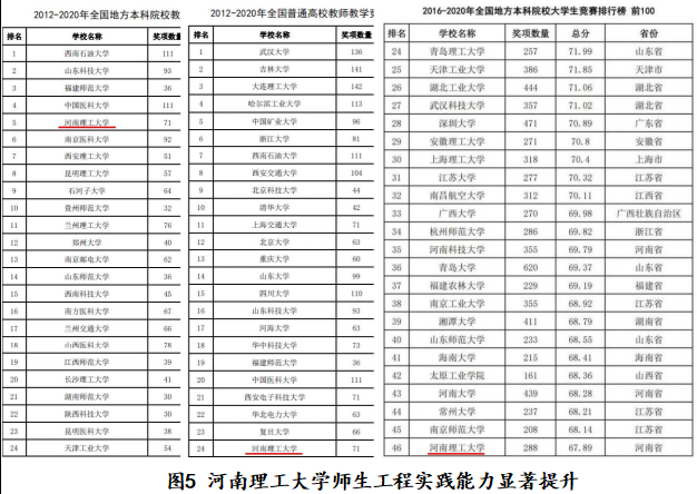 课题成果推广应用以来,学生每年在“互联网+”大学生创新创业大赛、全国大学生数学建模竞赛、ACM-ICPC国家大学生程序设计竞赛和全国大学生智能汽车竞赛等赛事中,获国家级奖励500余项,获省级及以上学科竞赛奖励6000余项。河南理工大学在2012-2020年全国普通高校教师教学竞赛分析报告中,名列全国本科高校第24名、全国地方本科院校第5名;在2016-2020年本科院校大学生竞赛排行榜中位居97名(见图5)。华北水利水电大学先后入选首批国家水情教育基地、水利部“强监管”人才培养基地,多次获“全国高校毕业生就业竞争力100强”称号。