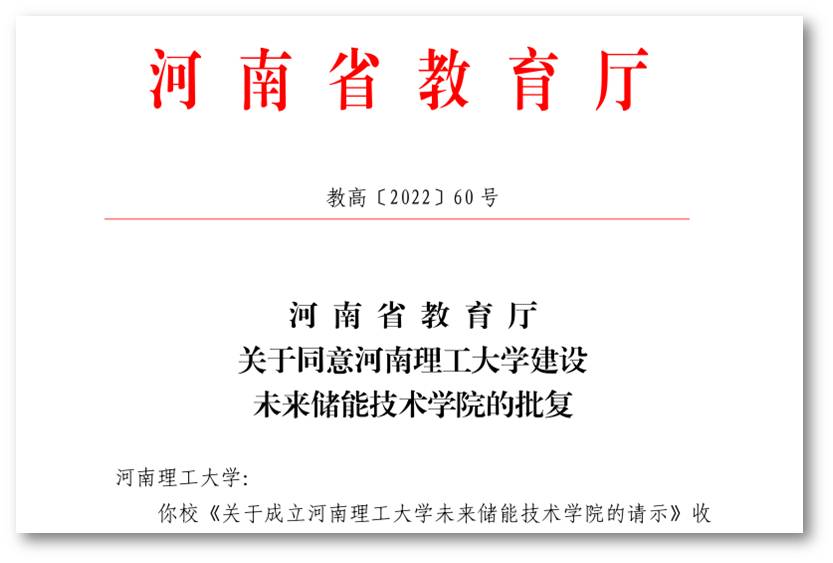 日前,河南省教育厅下发《关于同意河南理工大学建设未来储能技术学院的批复》(以下简称“批复”,教高〔2022〕60 号),批准我校建设未来储能技术学院。