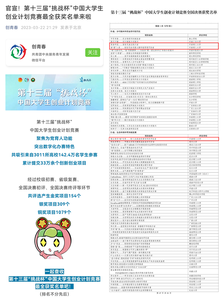 本网讯 (通讯员 莫小华/文 余彬彬/图)3月19日,由共青团中央、教育部、人力资源社会保障部、中国科协、全国学联和北京市人民政府主办的第十三届“挑战杯”中国大学生创业计划竞赛在北京落下帷幕,我校三件作品获得铜奖。 本届“挑战杯”中国大学生创业计划竞赛聚焦创新、协调、绿色、开放、共享五大发展理念和乡村振兴战略,设置科技创新和未来产业、乡村振兴和农业农村现代化、社会治理和公共服务、生态环保和可持续发展、文化创意和区域合作等五个组别,涵盖农林、畜牧、食品及相关产业、生物医药、化工技术、环境科学、电子信息、材料类、机械能源、工艺与设计、服务资讯等领域,共吸引来自3011所高校142.4万名学生参赛,累计提交33万余个创新创业项目。经过校级初赛、省级复赛、全国决赛初评、全国决赛终评等环节共评选产生1542个获奖项目。由电气学院推荐,刘群坡、王瑞、杜少通、王立国、艾立旺老师指导的乡村振兴和农业农村现代化类作品《智渔科技—智能化渔业践行者》,由物电学院推荐,李亚、霍静娟老师指导的乡村振兴和农业农村现代化类作品《请“菌”入翁——智能化食用菌大棚种植管理开拓者》,由化工学院推荐,李望、朱晓波老师指导的生态环保和可持续发展类作品《微生物化“碱”为常—铝工业废渣资源化利用开拓者》3个作品获得国家铜奖。此外,在2022年“挑战杯”河南省大学生创业计划竞赛中,我校42件作品获得省级奖项,其中荣获特等奖3项,金奖7项,银奖9项,铜奖23项,33名指导教师获省级优秀指导教师荣誉称号,学校获得“优胜杯”荣誉称号,获奖作品数量创新高。 “挑战杯”中国大学生创业计划竞赛,作为一项具有导向性、示范性和群众性的全国竞赛活动,在大力实施“科教兴国”战略,培养复合型、创新型人才,造就一代符合未来挑战要求的高素质人才,促进高校产学研结合等方面发挥着重要作用。为更好的参与此次“挑战杯”中国大学生创业计划竞赛,学校主管学生工作领导亲自挂帅,校团委、教务处、科技处、社科处、招就处、创新创业学院等部门通力合作,各学院积极动员专业教师主动参与,从参赛团队培训、项目选题、申报遴选、作品打磨,组织参加省赛、国赛赛前集中培训,作品指导包装等全程周密部署,细致安排,为参赛团队提供了保障。接下来,校团委将以“挑战杯”系列竞赛为龙头赛事,牢记习近平总书记嘱托,胸怀“国之大者”,投身强国伟业,坚持为党育人,培养学生创新意识、提升学生创造能力、鼓励青年学生积极投身创业实践,以实际行动贯彻落实党的二十大精神,把创新创业的理想追求融入党和学校教育事业之中,为以中国式现代化全面推进中华民族伟大复兴贡献青春才智! |