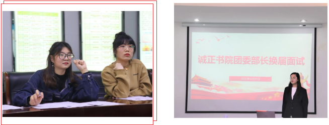 为提升诚正书院基层团组织的运行活力,促进团委组织建设的有序发展,4月29日晚、5月21日下午,书院团委于121会议室举行第一届团委干部换届面试,共有部长与副部长两个面试会场,由团委副书记以及各部门部长担任评委,6名副部长与29名干部分批次到场参与。此次换届工作秉持公平、公开、公正的原则,分次序、分小组对参选人员进行面试,共分为参选人员自我介绍以及现场评委提问两个环节。