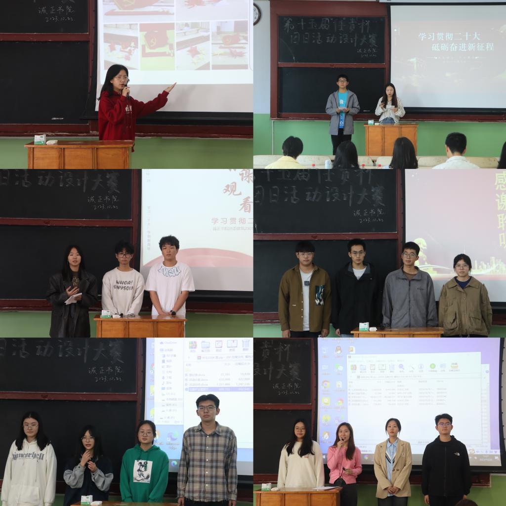 为引导广大青年深刻领悟习近平新时代中国特色社会主义思想和党的二十大精神,成长为“有理想、敢担当、能吃苦、肯奋斗”的社会主义现代化建设者和接班人,做勇担民族复兴大任的新时代追梦人、圆梦人。10月22日下午,由诚正书院团委主办、诚正书院宣传中心承办的以“学习贯彻二十大,砥砺奋进新征程”为主题的“任责杯”团日活动设计大赛准时举办。比赛邀请诚正书院党政办负责人陈鑫、辅导员李雪峰老师、具有参赛经验的高年级同学及书院各学生组织主席团成员担任活动评委。