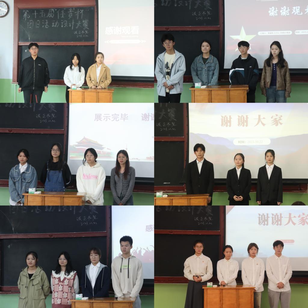 本次比赛共计23个团支部组队参赛,各参赛团支部在规定时间内登台,通过PPT讲解、播放视频的形式来展示团支部活动成果与收获,并与评委进行答辩互动。围绕活动主题,各团支部分别通过开展进入养老院向失能的老人唱红歌、讲党史下乡开展墙绘公益宣传活动、开展红色经典读书会、向小学生讲解党的二十大精神等开展形式多样、内容丰富的团日活动,经过激烈的角逐和公平、公正、公开的评审,设计2304团支部、设计2303团支部最终胜出,将代表诚正书院参加校级“任责杯”团日活动设计大赛复赛。
