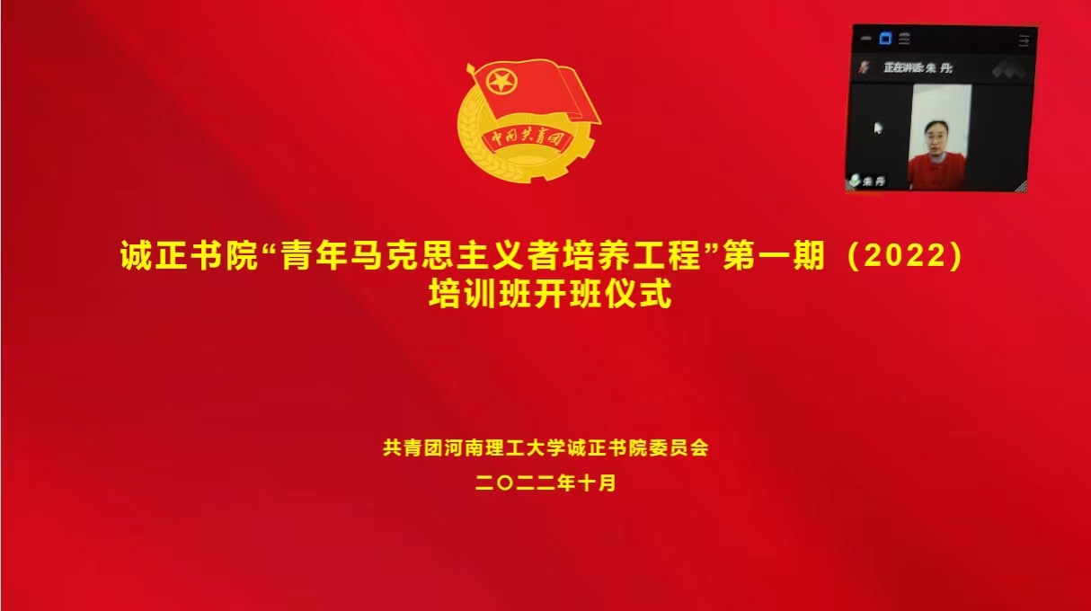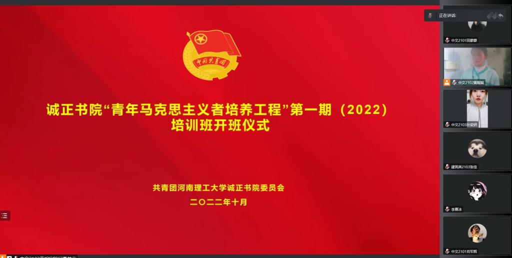 为深入学习宣传贯彻党的二十大精神,认真落实习近平总书记关于青年工作的重要思想,深入推进青年马克思主义者培养工程,引导诚正书院青年学生厚植爱党爱国的理想信念,10月28日下午,诚正书院第一期“青年马克思主义者培养工程”培训班开班仪式以线上方式举行,团委负责人朱丹以及青马班全体成员参加本次开班仪式。