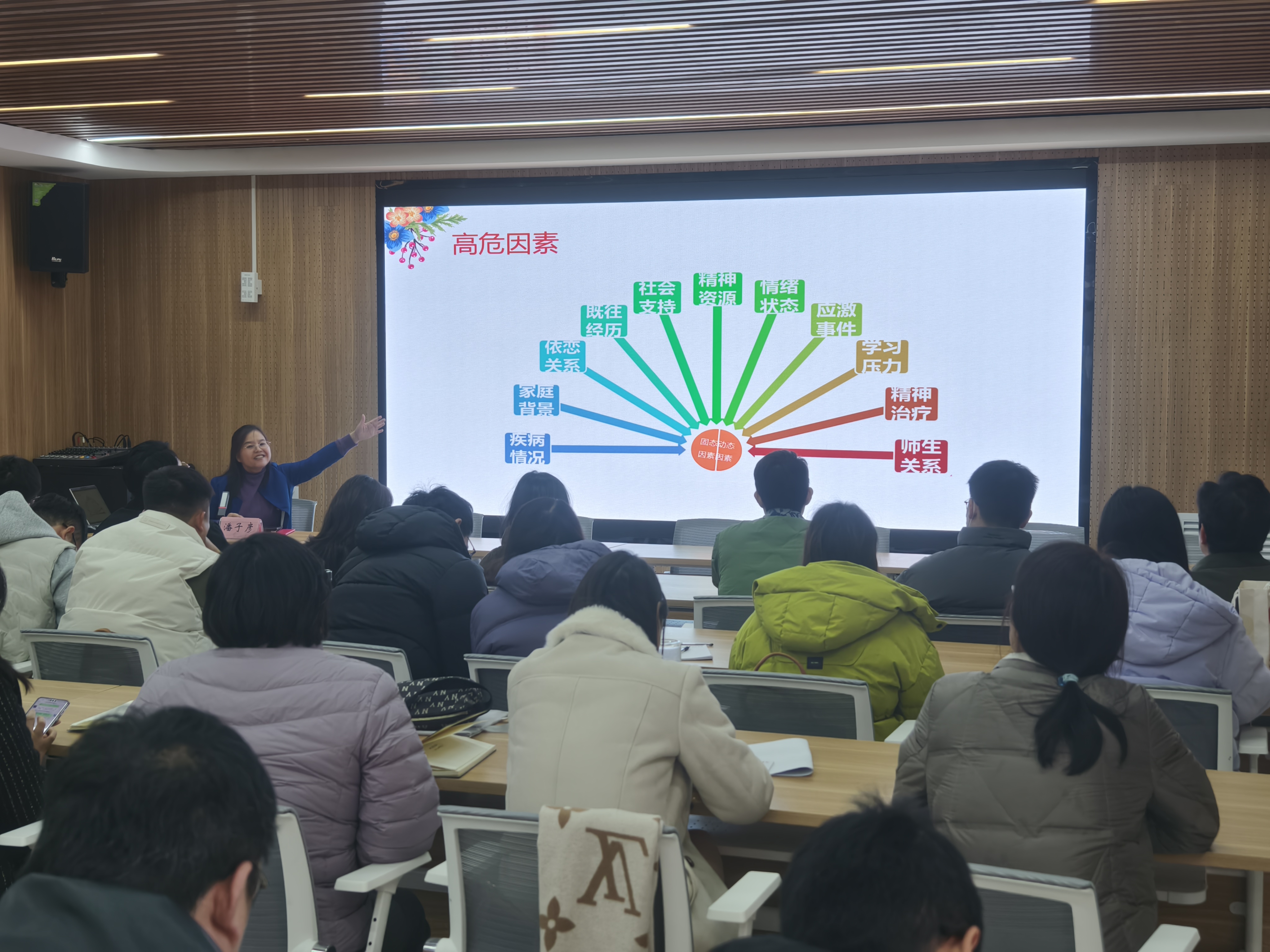 随后,讲座围绕学生心理危机的主要诱因、识别维度及典型表现展开,助力育人导师实现心理危机“早发现、早预警”。在心理危机处理方面,结合学校现有心理健康工作体系,明确了育人导师的职责定位、情感支持方式及规范的报告转介流程,同时分享了相关前沿工作思路。此外,还倡导“爱满自溢”的自我关怀理念,为育人导师提升自身心理能量提供了指引。