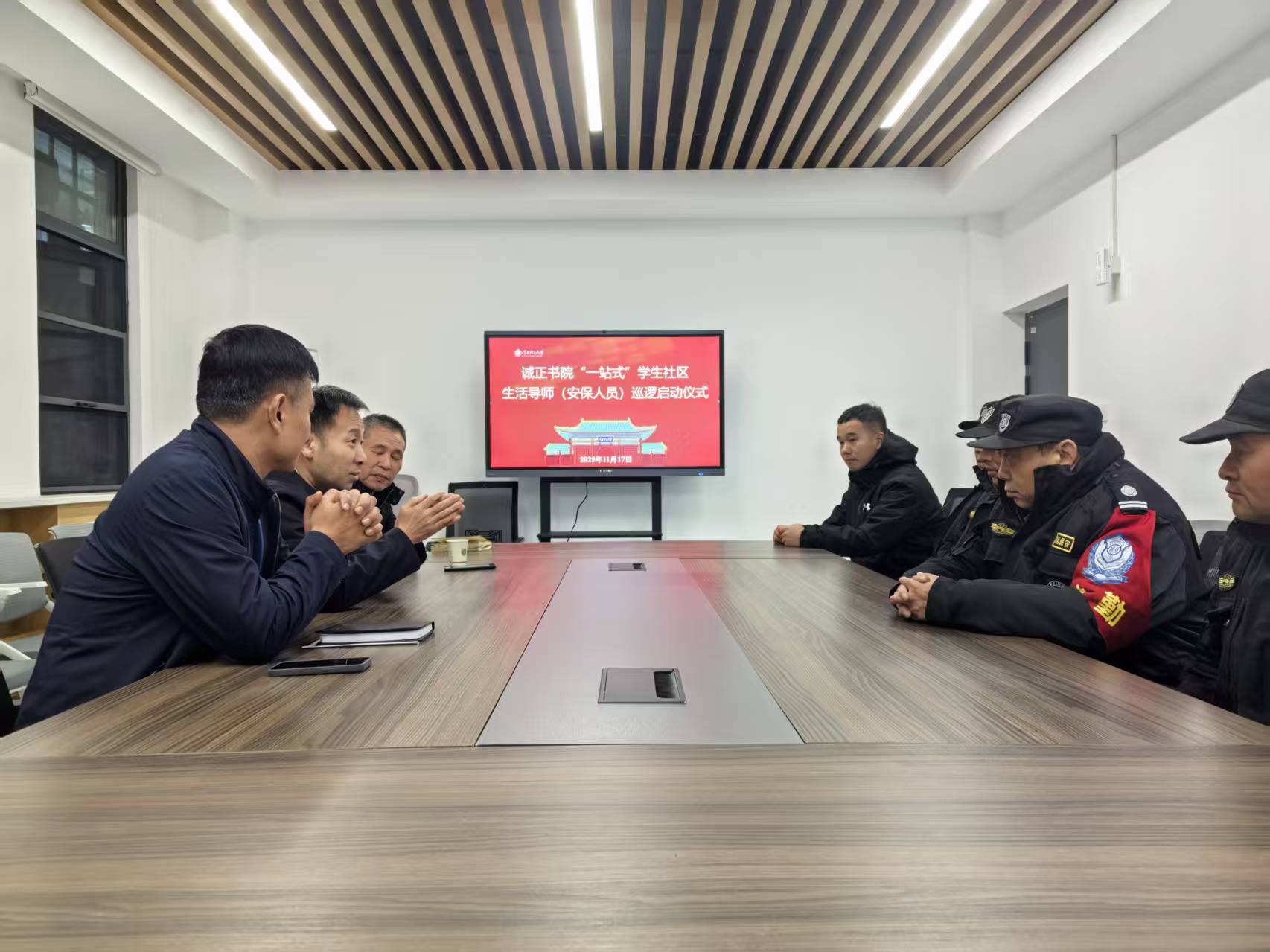 11月17日下午,“一站式”学生社区晚间安全巡逻启动仪式在社区二楼会议室顺利举行。诚正书院(“一站式”学生社区)党建委书记、管委会主任孙彦,党建委副书记、管委会副主任李旭升,保卫处段宏江老师以及全体生活导师(安保人员)共同参加。仪式由李旭升主持。