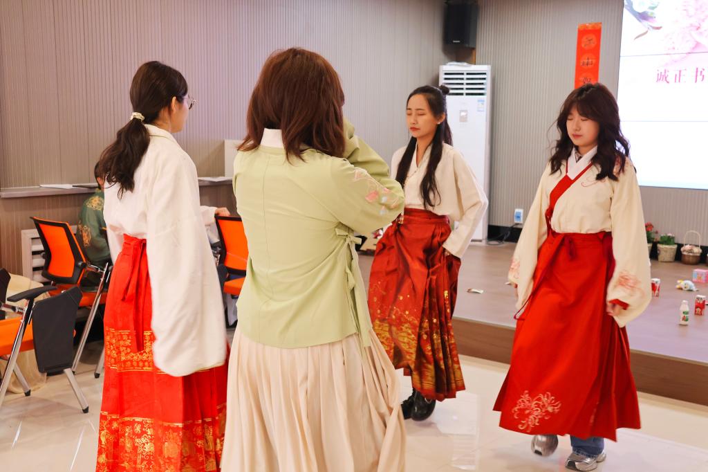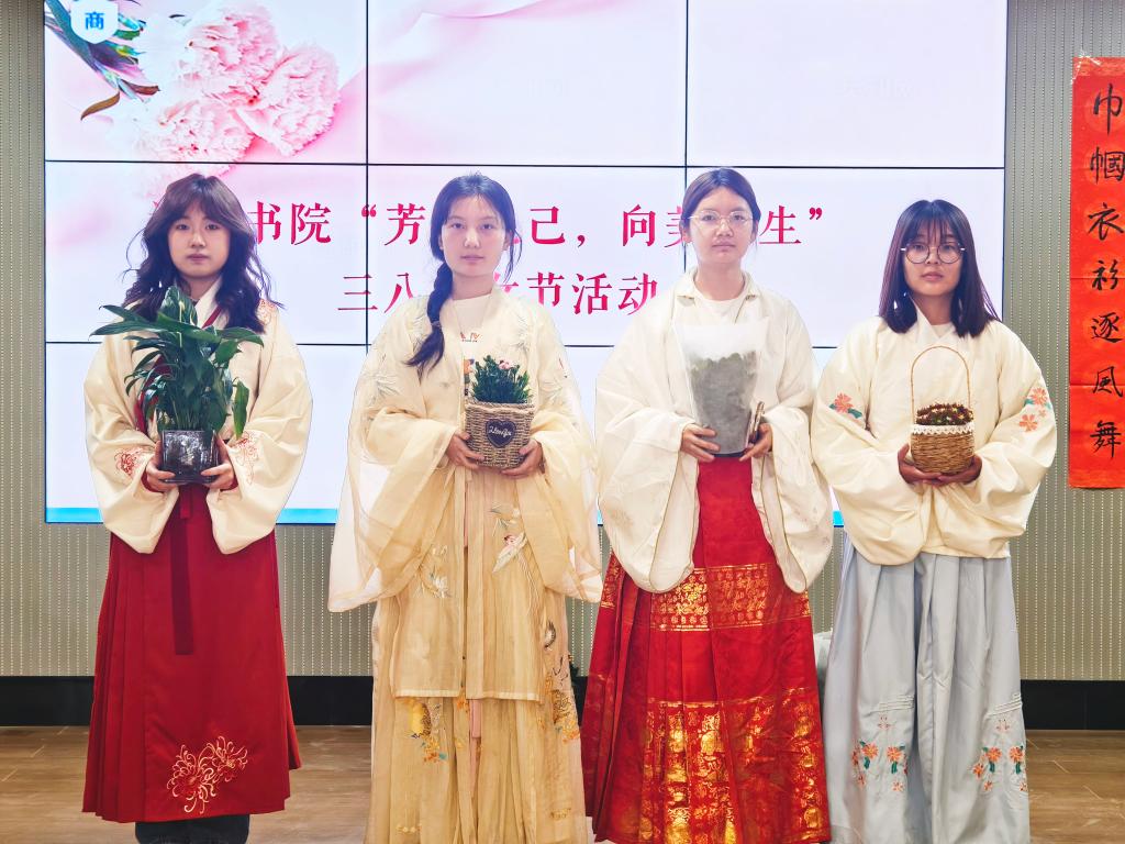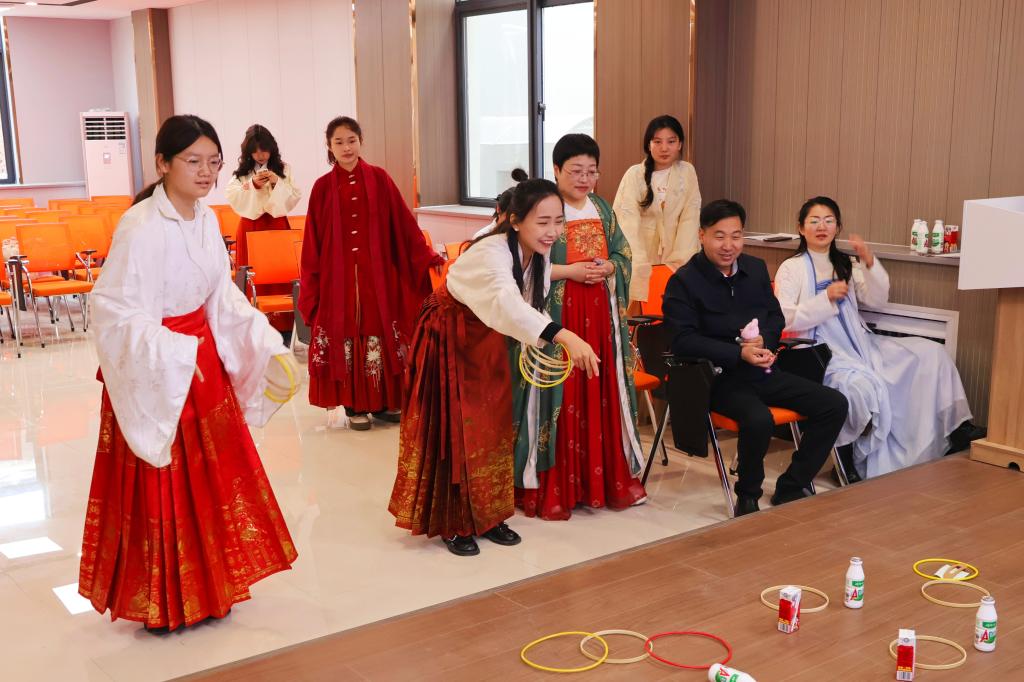 活动伊始,孙彦发表节日致辞,为书院女性送上温情祝福。活动准备了“笔绽巾帼风”、“欢乐抢凳子”、“迎春踏步走”和“幸运套不停”四个环节,展现老师们和学生们青春洋溢风采。活动过后,学生们根据各环节累计积分来兑换盆栽、水果、盲盒等奖品,并合影留念。