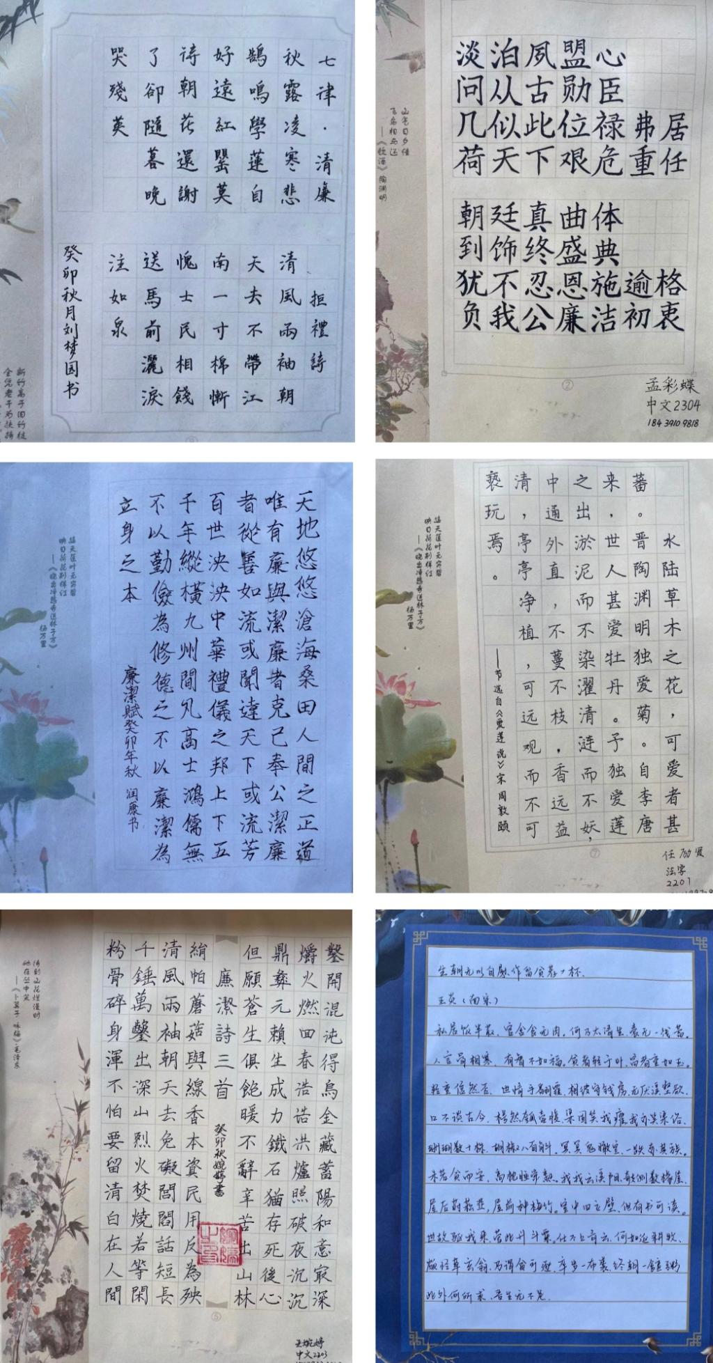 本次活动面向诚正书院全体师生,共征集硬笔书法作品200余幅。书法作品内容紧扣廉洁主题,用生动的笔触将廉洁正气描绘在纸上。这些作品或遒劲有力、力透纸背,或柔美娟秀、清灵淡雅,或潇洒飘逸、行云流水,每幅作品字里行间都流露出书院师生弘扬清廉之风的信心。经过初审、复审等多轮评比,最终评选出一等奖1名,二等奖3名,三等奖6名。优秀书法作品现已在书院门口持续展出,供师生欣赏学习。