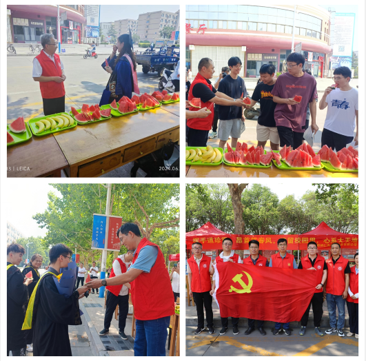 挥手道珍重,情留校园里,6月20日—21日宿教党支部联合仁和物业公司在后勤保障部党总支的指导下,开展毕业生离校服务活动,9名党员志愿者和10余名仁和物业员工给学生送西瓜,搬运行李为毕业生送去清凉和关怀。