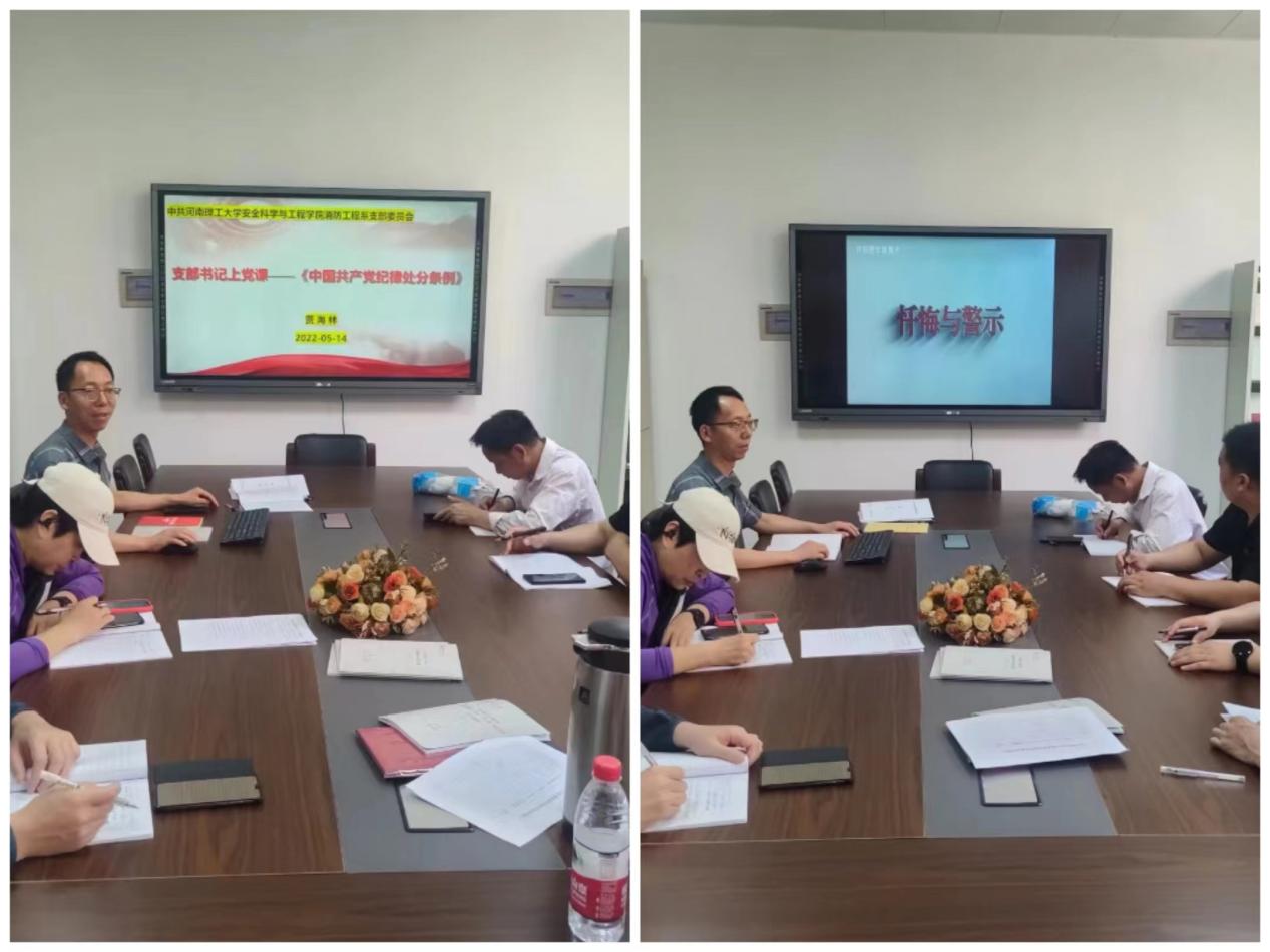 为贯彻落实学校党纪学习教育要求,5月14日下午,消防工程系党支部在学院218党员活动室开展《中国共产党纪律处分条例》(以下简称《条例》)专题党课学习。党支部书记贾海林主持会议并进行党课领学,消防工程系全体教师参加了学习。