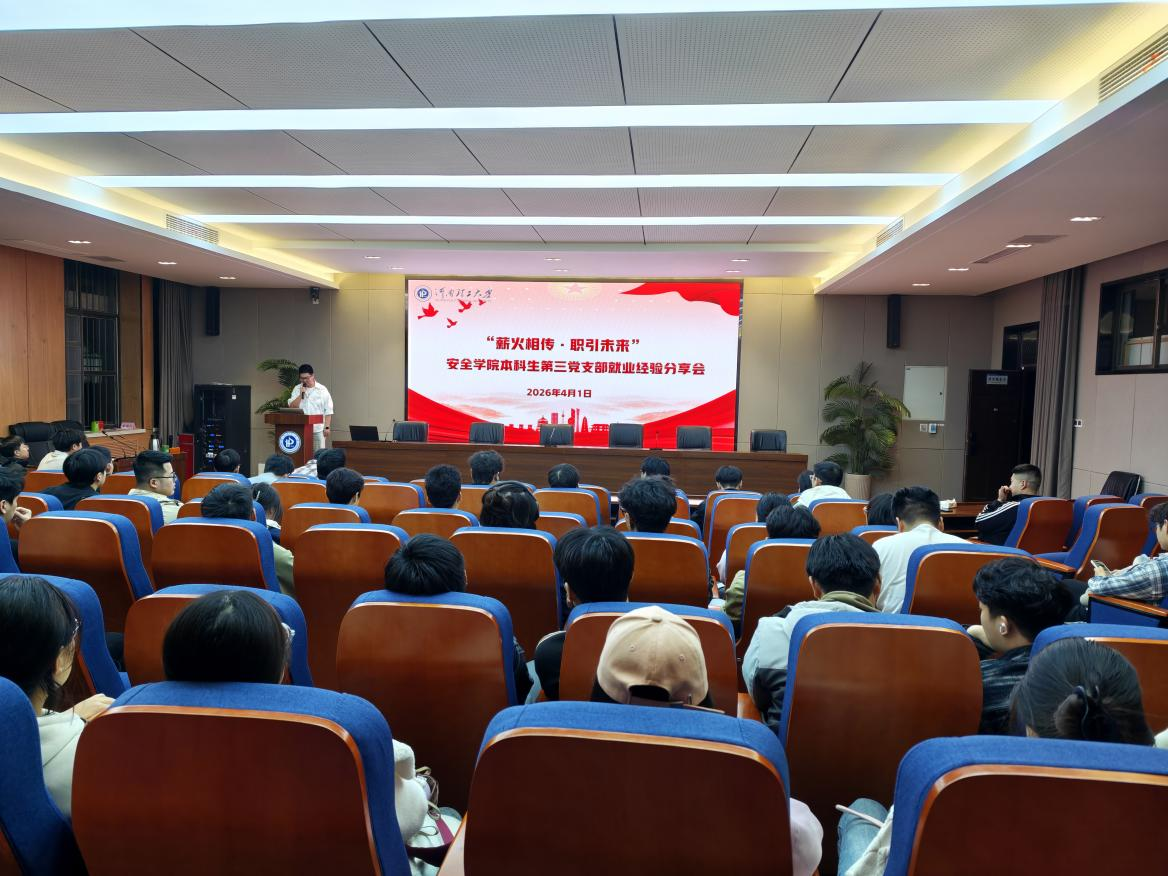 为帮助学生明晰就业方向,做好职业规划,4月1日,安全学院本科生第三党支部在学院101会议室举办“润德讲堂”暨“薪火相传・职引未来” 就业经验分享会。邀请2026届优秀毕业生劳向宇、王亚鹏、谢恒、毕永鑫等4人做分享,2023级100余名学生参加。