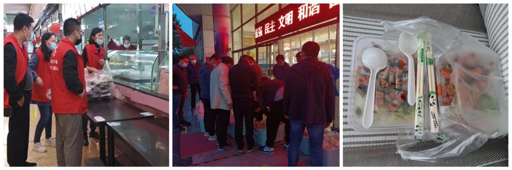 学院领导收到学校紧急通知后,考虑到学生的日常饮食,领导紧急组织并安排学院老师准备送餐,学院领导、老师和辅导员准时前往学府食堂,有序分至各个窗口统一购置午餐并运送至宿舍楼门口,并由寝室长及时领取交至学生手中。学院考虑到少数民族的饮食习惯,安排专人前往特定窗口与超市为少数民族同学准备热餐和生活用品,同学们手提各式餐盒,纷纷表达对学院的诚挚感谢,并保证坚决服从学院安排与指挥。