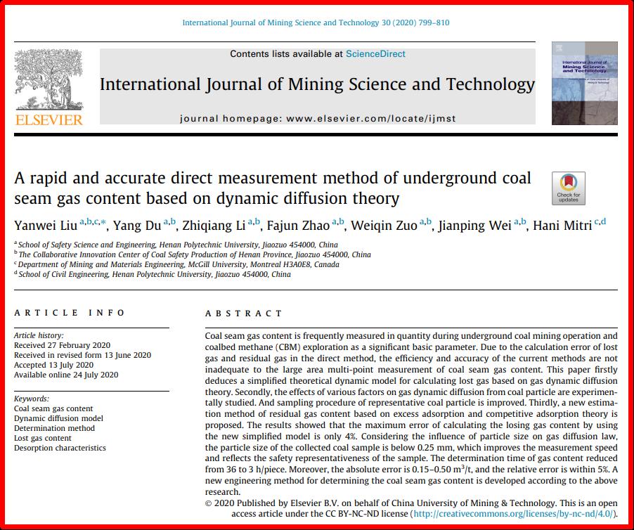 近日,河南省煤矿安全与职业危害防治国际联合实验室刘彦伟教授团队与加拿大麦吉尔大学Hani Mitri教授合作,在国际权威学术期刊《中国矿业大学学报(英文版)》(《International Journal of Mining Science and Technology》)上发表题为“A rapid and accurate direct measurement method of underground coal seam gas content based on dynamic diffusion theory”的研究成果。《中国矿业大学学报(英文版)》是中科院SCI 1区Top期刊,主要刊载采矿工程,矿山安全科学和技术,矿物加工,地质力学和地质工程,地质工程,采矿环境与可持续发展等方面的论文,最新影响因子为7.67。