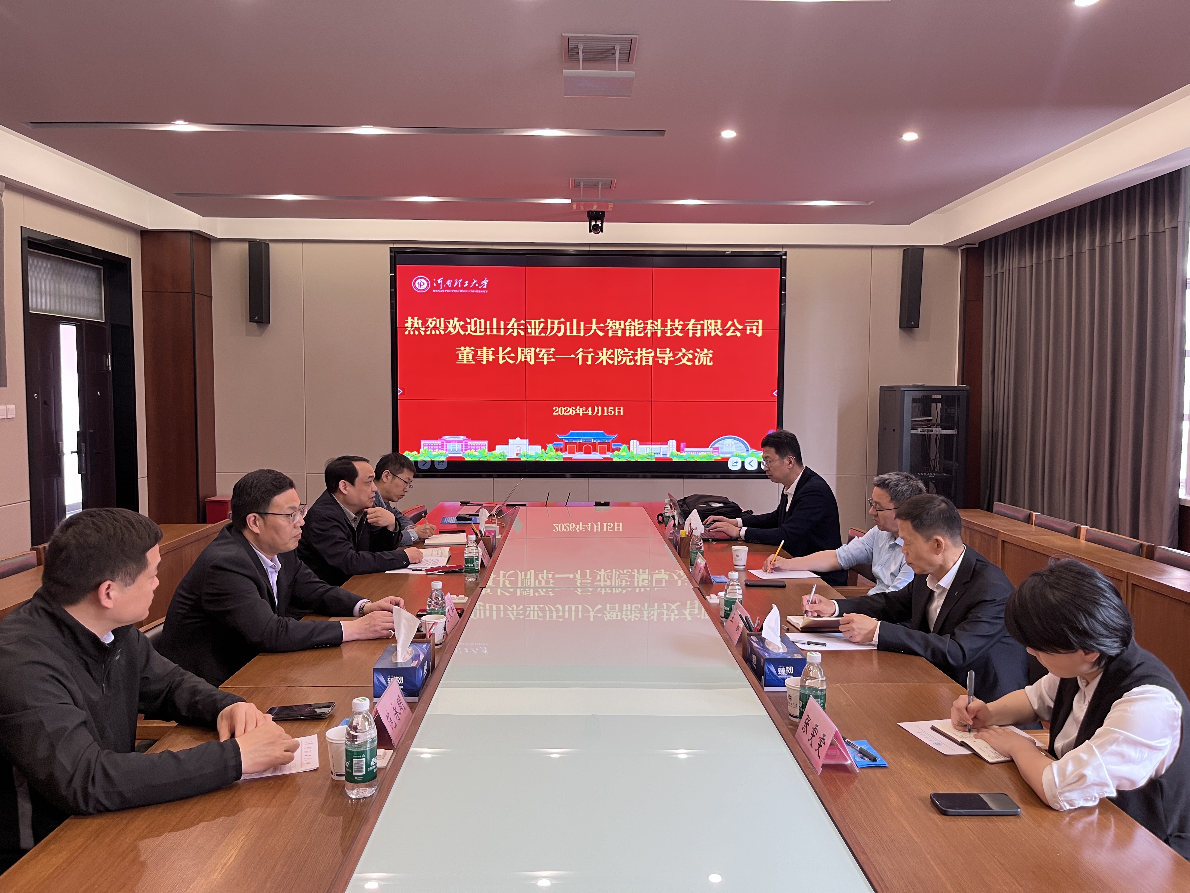 4月15日下午,山东亚历山大智能科技有限公司董事长周军一行4人来学院进行交流访问。学院党委书记刘文军,校办副主任、校友办主任范永明,副院长潘荣锟以及学院教授代表参加了此次交流活动。