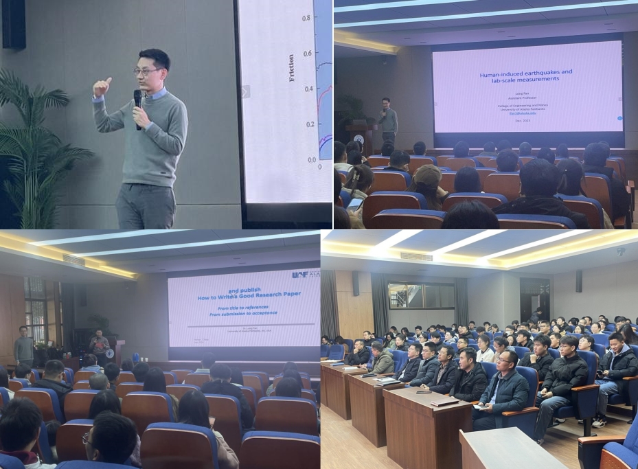 第一场讲座,樊龙教授介绍了人类活动诱发地震的机理模型以及在能源生产中由于地下注液、气诱发地震的案例。通过介绍现有实验成果,着重强调了微震探测技术对煤层气开采、地热开采、储层增透过程中的应用。随后,学院老师和研究生与樊龙教授进行了深入热烈的讨论,对煤样尺寸在实验过程中的影响、低渗岩层渗透性系数测定等问题进行了交流,并探讨了相关领域的合作机会。第二场讲座,樊龙教授针对研究生在撰写学术论文中面临的困惑,从标题到参考文献,从论文起草到提交再到接收等方面为大家详细介绍了科技论文写作的基本技巧及投稿过程,旨在提高学生撰写科技论文的能力。同时,樊龙教授也为大家介绍了在美国阿拉斯加州立大学的科研工作经历、讲述了国内外学习存在的差异,普及了留学政策以及如何申请出国等,为有意愿去美国留学的同学提供了宝贵的信息。樊龙教授的精彩讲座,拓宽了我院学生的科研与国际视野。