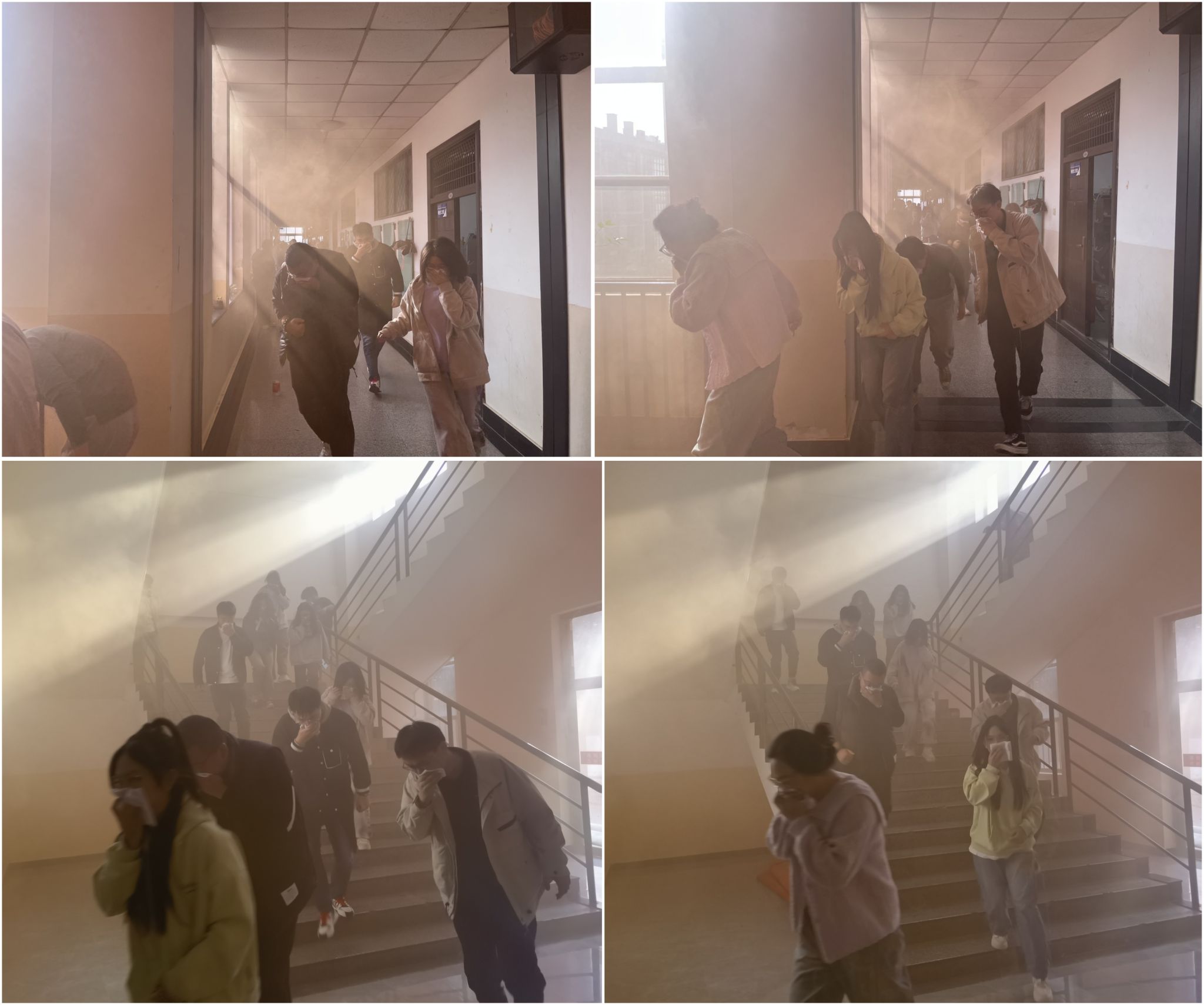 在演练开展前,学校保卫处消防专员杨海军老师详细讲解了遇到火灾时的基本逃生知识和技能。随后,消防专员宣布开始演习,点燃烟幕弹,学院楼内警报声骤然响起,在演练志愿者的有序引导下,楼内的师生按照逃生演练的要求,掩住口鼻、弯腰扶墙,迅速撤离到了指定安全区域。整个演练过程紧张而有序,充分展现了学院研究生良好的应急反应能力。