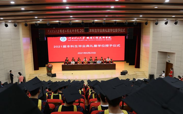 ??6月23日上午,河南理工大学鹤壁工程技术学院2021届毕业生毕业典礼暨学位授予仪式在学院诚信礼堂举行。校长杨小林、副校长沈记全,鹤壁市副市长李小莉、市政府副秘书长李忠生,河南理工大学鹤壁工程技术学院党委书记孙斌、院长蔡太生出席,学校相关职能部门和学院负责同志、鹤壁工程技术学院2021届毕业生及师生代表参加。仪式由孙斌主持。