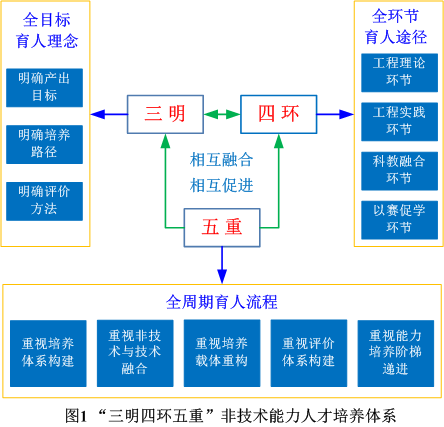 本成果紧紧抓住高等学校培养方案改革的顶层设计,重塑“明确产出目标、明确培养路径、明确评价方法”的全目标育人理念;从“工程理论、工程实践、科教融合、以赛促学”全环节提升学生非技术能力培养效果;实施“重视培养体系构建、重视非技术与技术能力融合、重视培养载体重构、重视评价体系构建、重视能力培养阶梯递进”全周期人才培养流程,形成了“三明四环五重”的非技术能力人才培养体系(图1)。