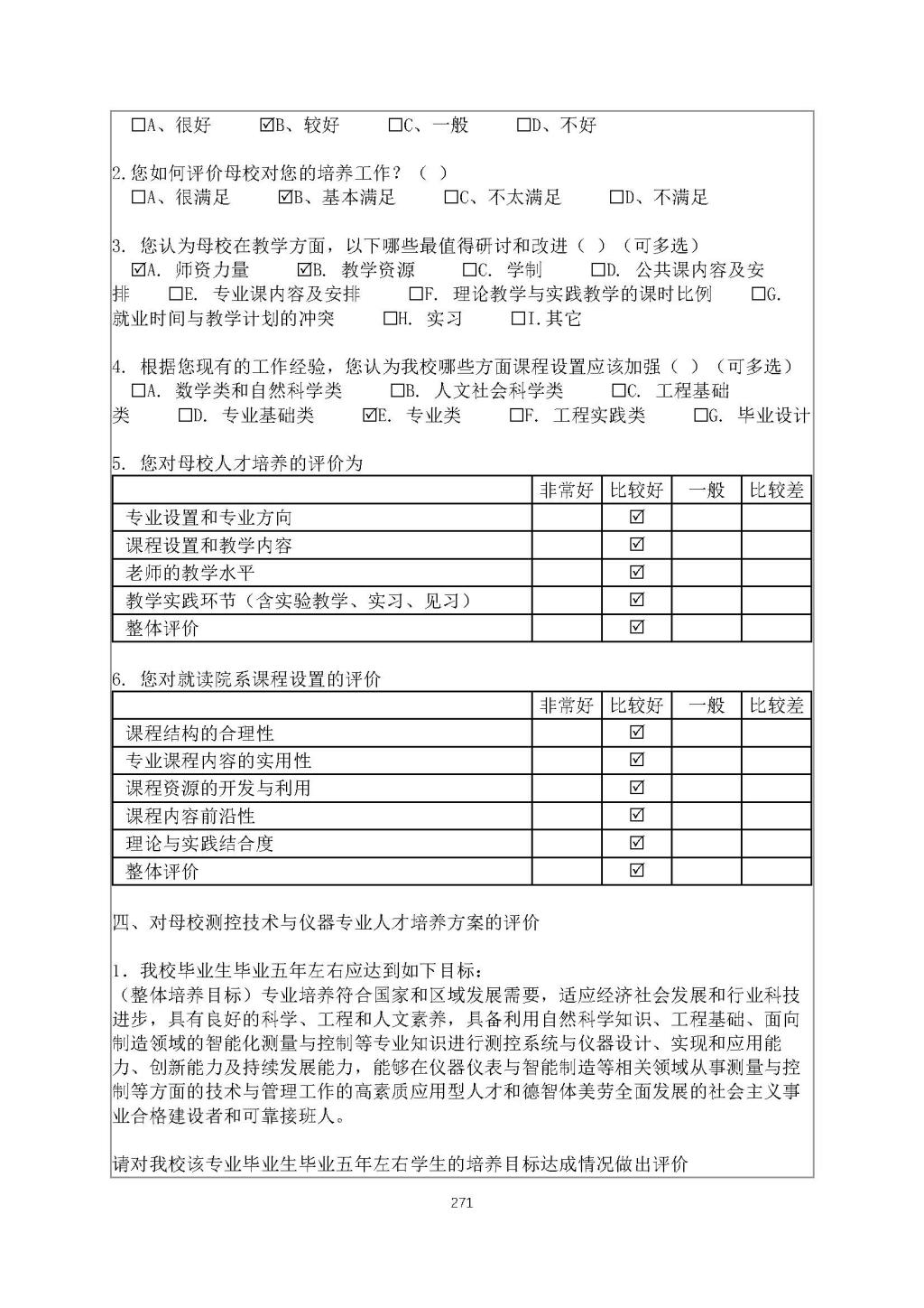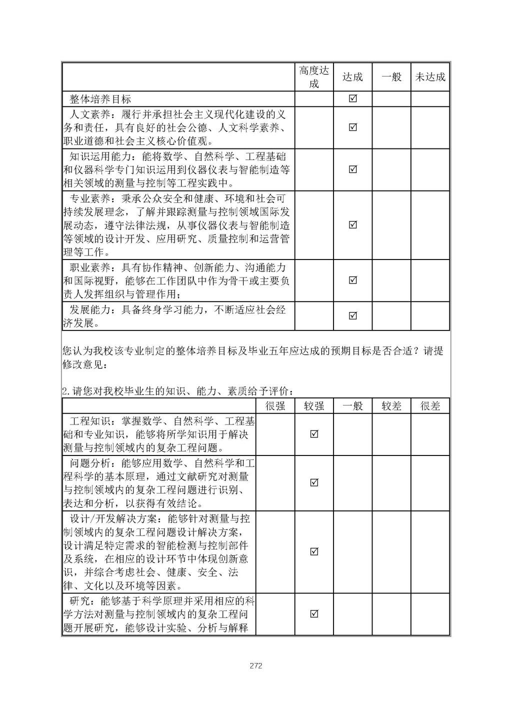 创建“OBE教学平台” 自2018年起面向校内学生、校外校友开展培养目标合理性评价。2020年发放调查问卷1582份,回收1207份。